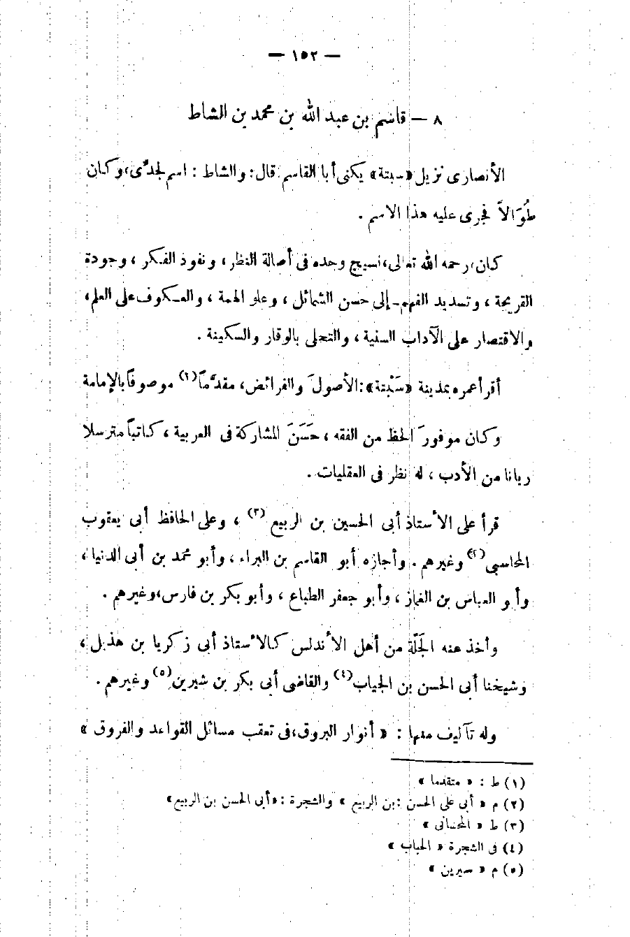 الأنصاري نزيل سبتة يكنى أبا القاسم قال: والشاط: اسم لجدي وكان طوالاً فجرى عليه هذا الاسم. كان رحمه الله تعالى نسيج وحده في أصالة النظر ونفوذ الفكر وجودة القريحة وتسديد الفهم إلى حسن الشمائل وعلو الهمة والعكوف على العلم والاقتصار على الآداب السنية والتحلي بالوقار والسكينة.