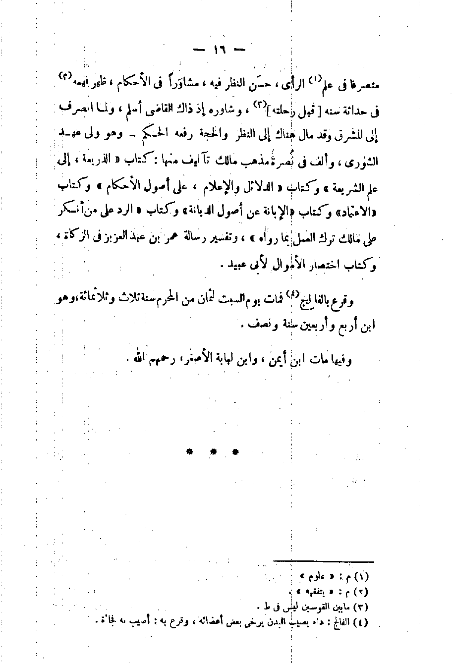 متصرفاً في علوم الرأي حسن النظر فيه مشاوراً في الأحكام ظهر فهمه في حداثة سنه قبل رحلته وشاوره إذ ذاك القاضي أسلم ولما انصرف إلى المشرق وقد مال هناك إلى النظر والحجة رفعه الحكم - وهو ولي عهد الشورى وألف في نصرة مذهب مالك تآليف منها: كتاب الذريعة إلى علم الشريعة وكتاب الدلائل والأعلام على أصول الأحكام وكتاب الاعتماد وكتاب الإبانة عن أصول الديانة وكتاب الرد على من أنكر على مالك ترك العمل بما رواه وتفسير رسالة عمر بن عبد العزيز في الزكاة وكتاب اختصار الأموال لأبي عبيد. وقرع بالفالج فمات يوم السبت لثمان من المحرم سنة ثلاث وثلاثمائة وهو بن أربع وأربعين سنة ونصف. وفيها مات ابن أيمن وابن لبابة الأصغر رحمهم الله.
