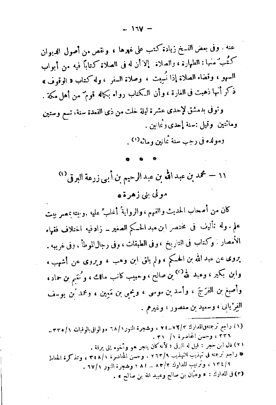 مولى بني زهرة كان من أصحاب الحديث والفهم والرواية أغلب عليه وبيته بمصر بيت علم وله تأليف في مختصر بن عبد الحكم الصغير - زاد فيه اختلاف فقهاء الأمصار. وكتاب في التاريخ وفي الطبقات وفي رجال الموطأ وفي غريبه. يروي عن عبد الله بن عبد الحكم ولم يلق بن وهب ويروي عن أشهب وابن بكير وعبد الله بن صالح وحبيب كاتب مالك ونعيم بن حماد وأصبغ بن الفرج وأسد بن موسى ويحيى بن معين ومحمد بن يوسف الفريابي وسعيد بن منصور وغيرهم.