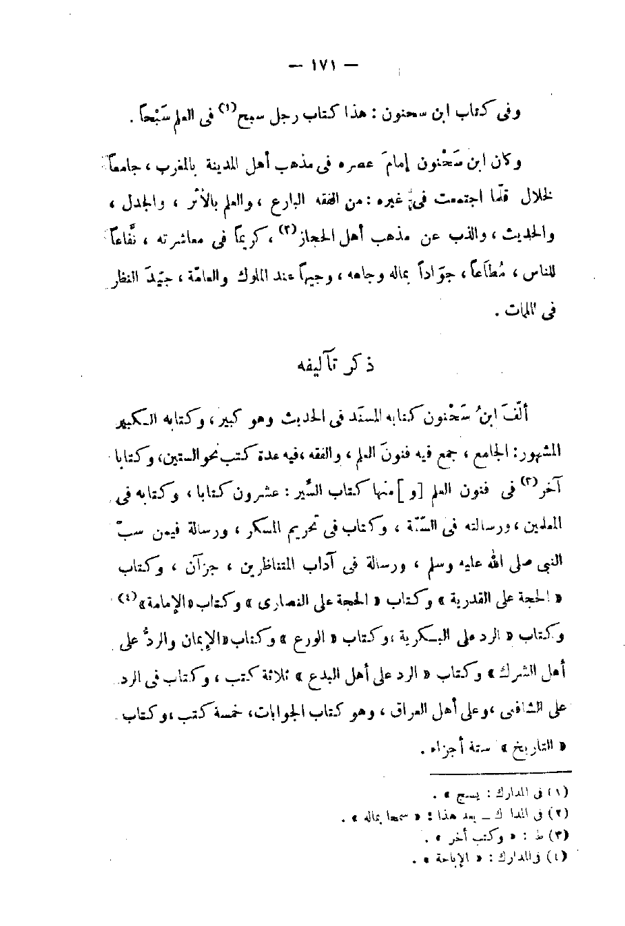 وفي كتاب بن سحنون: هذا كتاب رجل سبح في العلم سبحاً. وكان بن سحنون إمام عصره في مذهب أهل المدينة بالمغرب جامعاً لخلال قل ما اجتمعت في غيره: من الفقه البارع والعلم بالأثر والجدل والحديث والذب عن مذهب أهل الحجاز كريماً في معاشرته نفاعاً للناس مطاعاً جواداً بماله وجاهه وجيهاً عند الملوك والعامة جيد النظر في الملمات.