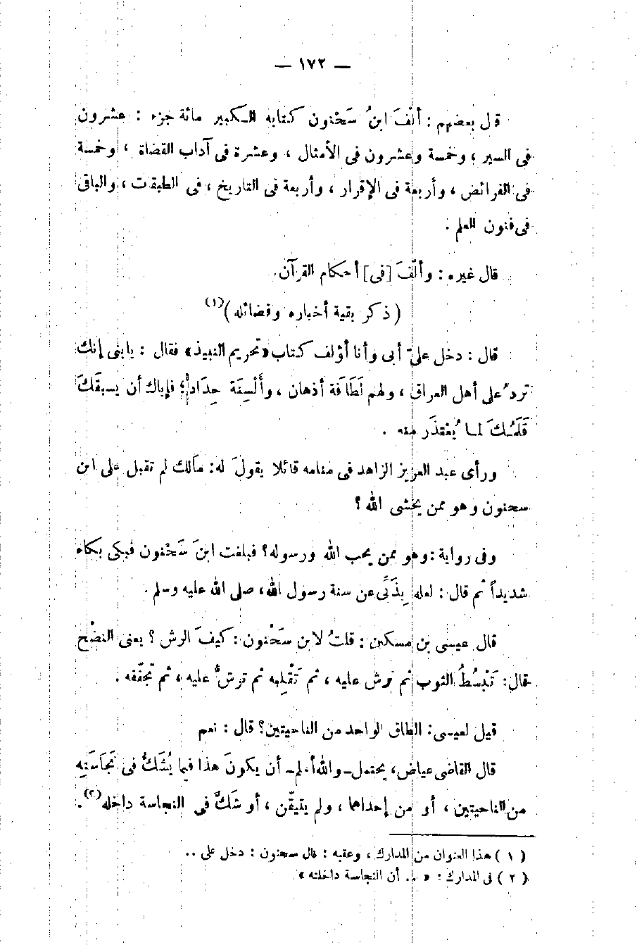 قال بعضهم: ألف بن سحنون كتابه الكبير مائة جزء: عشرون في السير وخمسة وعشرون في الأمثال وعشرة في آداب القضاة وخمسة في الفرائض وأربعة في الإقرار وأربعة في التاريخ في الطبقات والباقي في فنون العلم. قال غيره: وألف في أحكام القرآن.