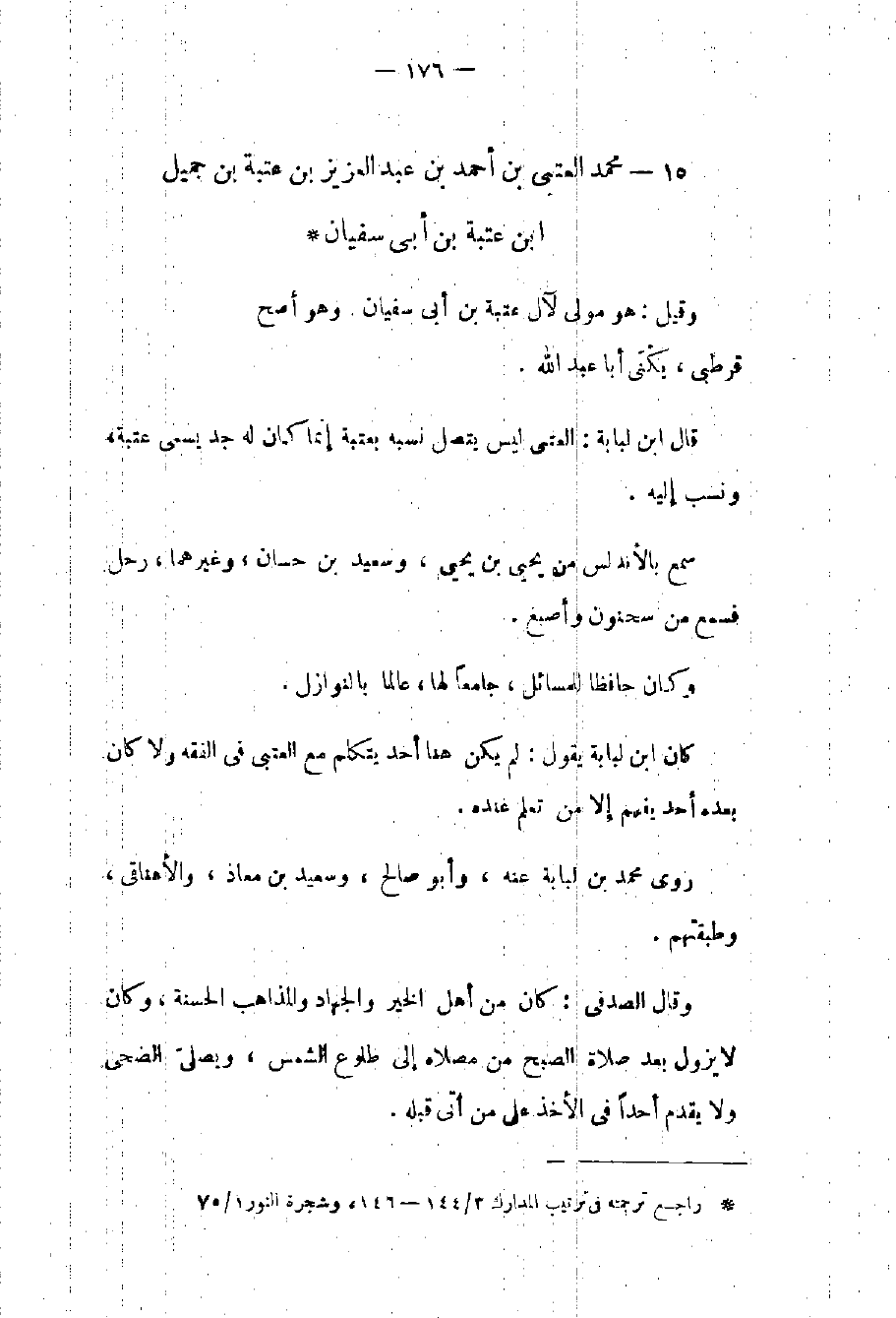 قيل: هو مولى لآل عتبة بن أبي سفيان وهو أصح. قرطبي يكنى أبا عبد الله. قال بن لبابة: العتبي ليس يتصل نسبه بعتبة إنما كان له جد يسمى عتبة ونسب إليه سمع بالأندلس من يحيى بن يحيى وسعيد بن حسان وغيرهما ورحل فسمع من سحنون وأصبغ. كان حافظاً للمسائل جامعاً لها عالماً بالنوازل. كان بن لبابة يقول: لم يكن هنا أحد يتكلم مع العتبي في الفقه ولا كان بعده أحد يفهم إلا من تعلم عنده.