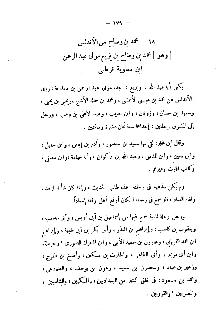 من الأندلس وهو محمد بن وضاح بن بزيع مولى عبد الرحمن بن معاوية قرطبي يكنى أبا عبد الله وبديع جده مولى عبد الرحمن بن معاوية روى بالأندلس عن محمد بن عيسى الأعشى ومحمد بن خالد الأشج ويحيى بن يحيى وسعيد بن حسان وزونان وابن حبيب وعبد الأعلى بن وهب ورحل إلى المشرق رحلتين: إحداهما سنة ثمان عشرة ومائتين. قال بن مخلد: لقي بها سعيد بن منصور وآدم بن إياس وابن حنبل وابن معين وابن المديني وعبد الله بن ذكوان وأبا خيثمة وابن مصفى وكاتب الليث وغيرهم. ولم يكن مذهبه في رحلته في هذه طلب الحديث وإنما كان شأنه الزهد ولقاء العباد فلو سمع في رحلته لكان أرفع أهل وقته إسناداً.
