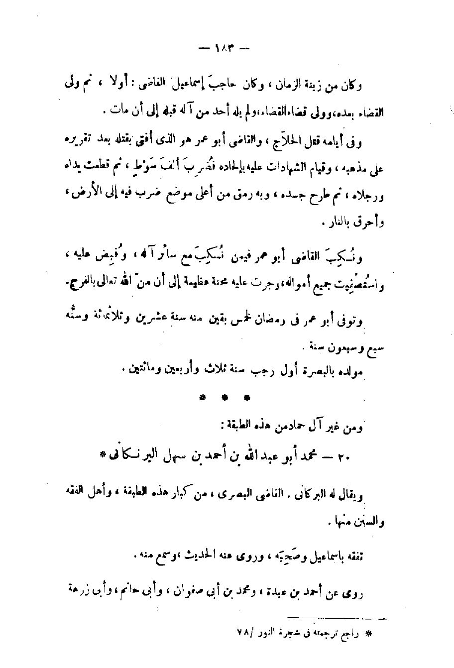 ويقال له البركاني. القاضي البصري من كبار هذه الطبقة وأهل الفقه والسنن منها. تفقه بإسماعيل وصحبه وروى الحديث وسمع منه. روى عن أحمد بن عبدة ومحمد بن أبي صفوان وأبي حاتم وأبي زرعة