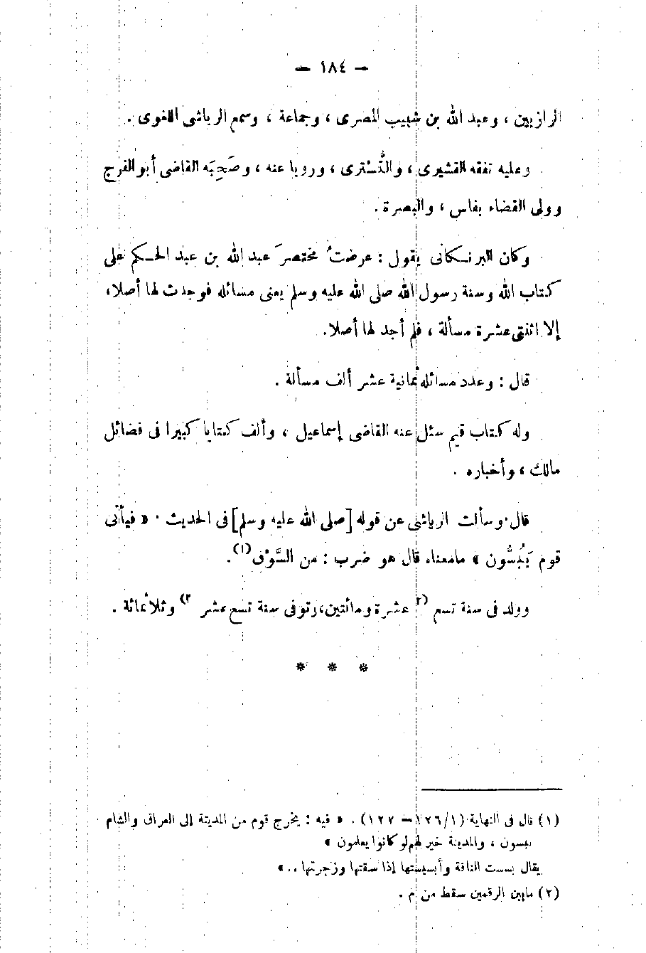 قال: وعدد مسائله ثمانية عشر ألف مسألة. وله كتاب قيم سئل عنه القاضي إسماعيل وألف كتاباً كبيراً في فضائل مالك وأخباره. قال وسألت الرياشي عن قوله صلى الله عليه وسلم في الحديث: " فيأتي قوم يبسون " ما معناه؟ قال: هو ضرب من السوق. وولد في سنة تسع عشرة ومائتين وتوفي سنة تسع عشر وثلاثمائة.