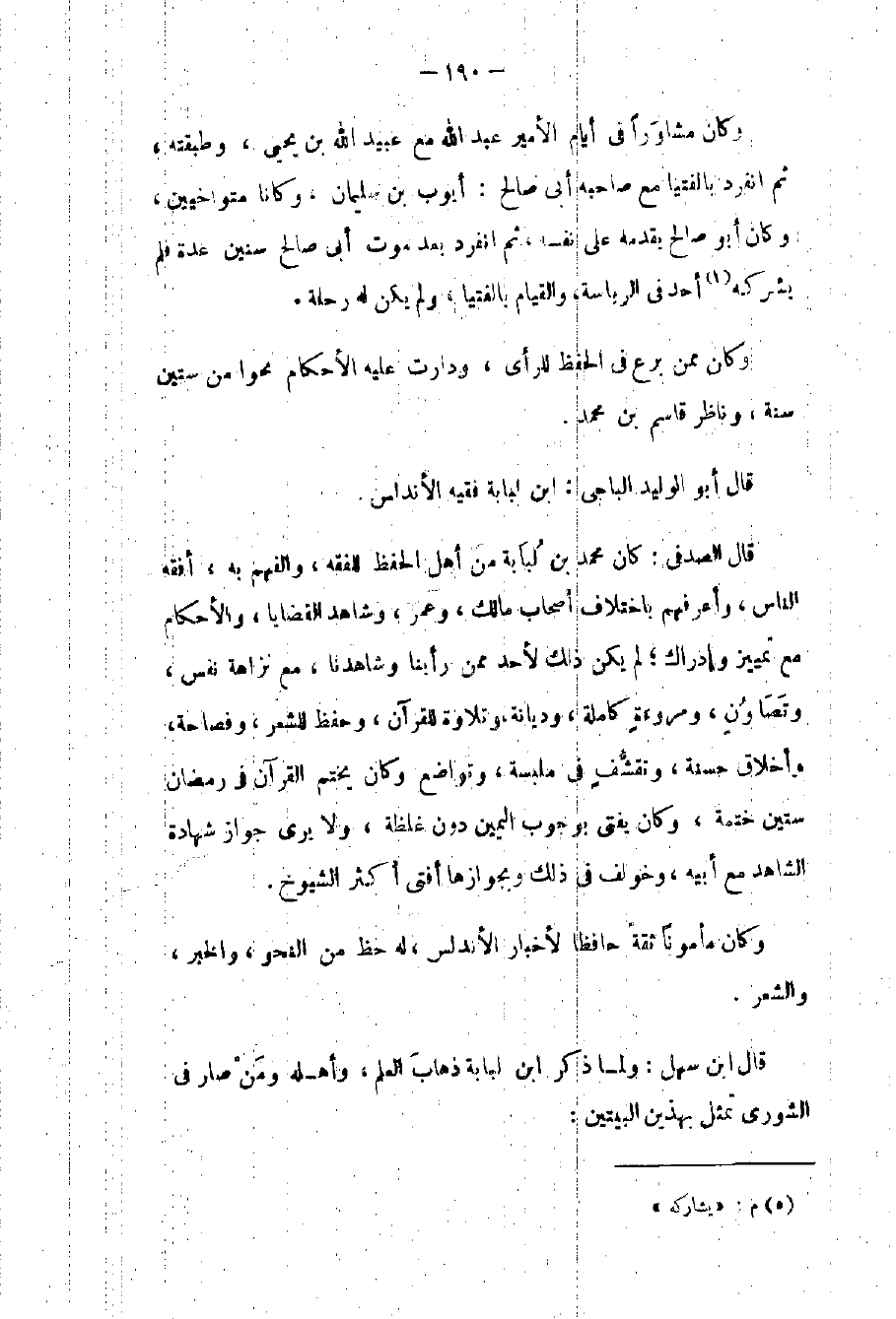 وكان مشاوراً في أيام الأمير عبد الله مع عبيد الله بن يحيى وطبقته ثم انفرد بالفتيا مع صاحبه أبي صالح: أيوب بن سليمان وكانا متواخيين وكان أبو صالح يقدمه على نفسه ثم انفرد بعد موت أبي صالح سنين عدة فلم يشركه أحد في الرياسة والقيام بالفتيا ولم يكن له رحلة. وكان ممن برع في الحفظ للرأي ودارت عليه الأحكام نحواً من ستين سنة وناظر قاسم بن محمد. قال أبو الوليد الباجي: بن لبابة فقيه الأندلس. قال الصدفي: كان محمد بن لبابة من أهل الحفظ للفقه والفهم به أفقه الناس وأعرفهم باختلاف أصحاب مالك وعمر وشاهد القضايا والأحكام مع تمييز وإدراك لم يكن ذلك لأحد ممن رأينا وشاهدنا مع نزاهة نفس وتصاون ومروءة كاملة وديانة وتلاوة للقرآن وحفظ للشعر وفصاحة وأخلاق حسنة وتقشف في ملبسه وتواضع وكان يختم القرآن في رمضان ستين ختمة وكان يفتي بوجوب اليمين دون غلظة ولا يرى جواز شهادة الشاهد مع أبيه وخولف في ذلك وبجوازها أفتى أكثر الشيوخ.
