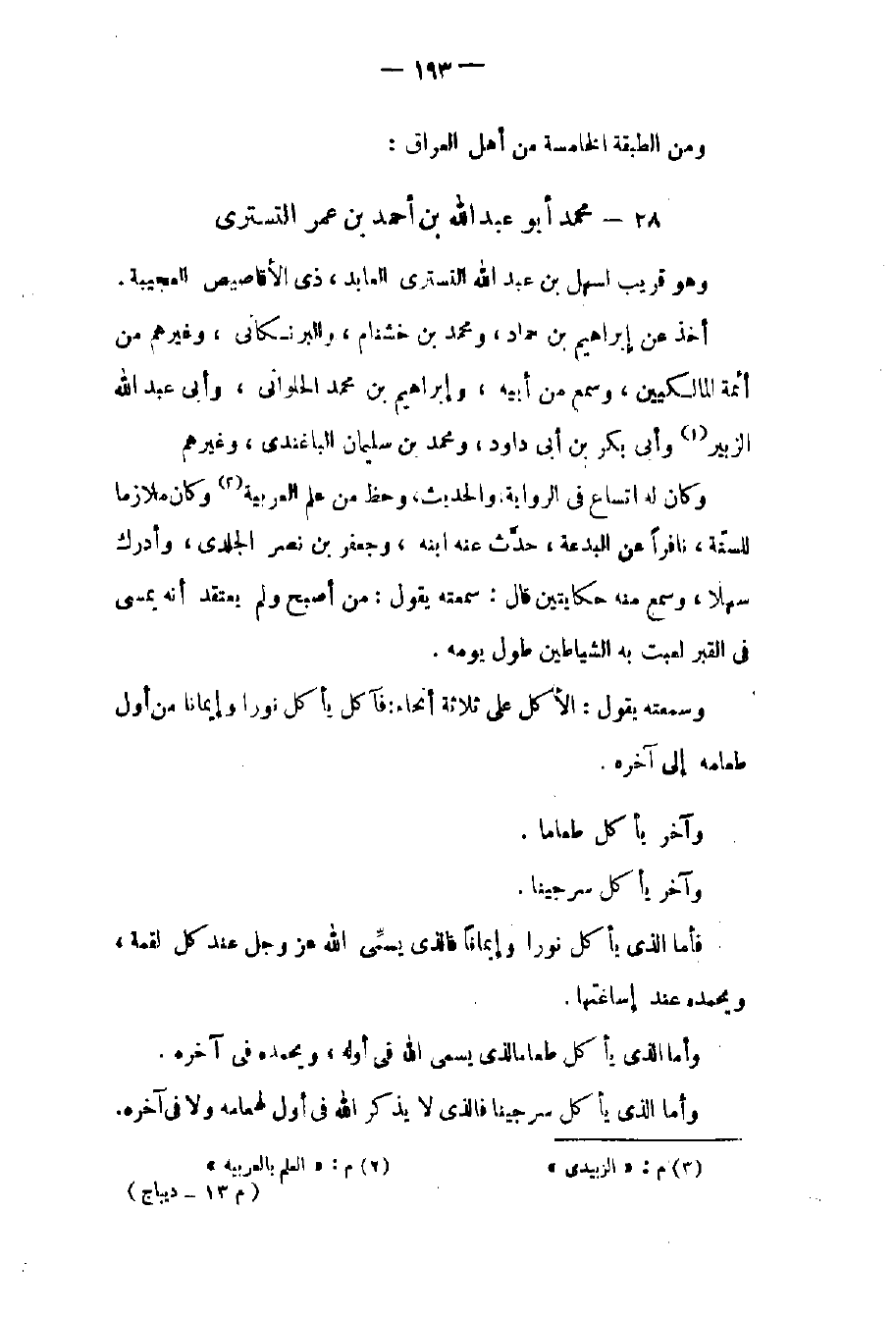 وسمعته يقول: الأكل على ثلاثة أنحاء: فآكل يأكل نوراً وإيماناً من أول طعامه إلى آخره. وآخر يأكل طعاماً وآخر يأكل سرجيناً. فأما الذي يأكل نوراً وإيماناً فالذي يسمي الله عز وجل عند كل لقمة ويحمده عند إساغتها. وأما الذي يأكل طعاماً فالذي يسمي الله في أوله ويحمده في آخره. وأما الذي يأكل سرجيناً فالذي لا يذكر الله في أول طعامه ولا في آخره.