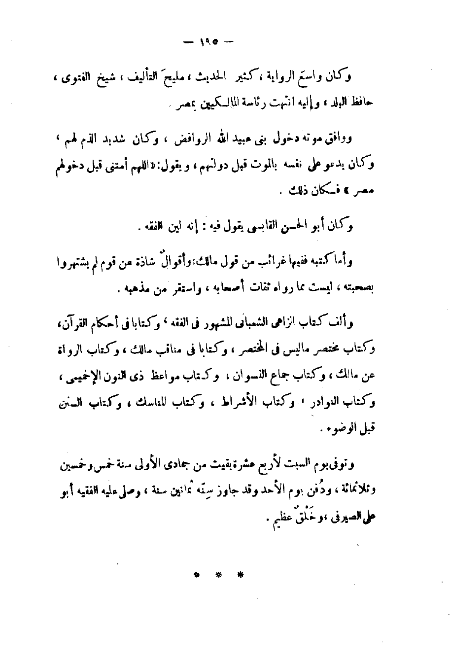 وأما كتبه ففيها غرائب من قول مالك وأقوال شاذة عن قوم لم يشتهروا بصحبته ليست مما رواه ثقات أصحابه واستقر من مذهبه. وألف كتاب الزاهي الشعباني المشهور في الفقه وكتاباً في أحكام القرآن وكتاب مختصر ما ليس في المختصر وكتاباً في مناقب مالك وكتاب الرواة عن مالك وكتاب جماع النسوان وكتاب مواعظ ذي النون الإخميمي وكتاب النوادر وكتاب الأشراط وكتاب المناسك وكتاب السنن قبل الوضوء. وتوفي يوم السبت لأربع عشرة بقيت من جمادى الأولى سنة خمس وخمسين وثلاثمائة ودفن يوم الأحد وقد جاوز سنه ثمانين سنة وصلى عليه الفقيه أبو علي الصيرفي وخلق عظيم.