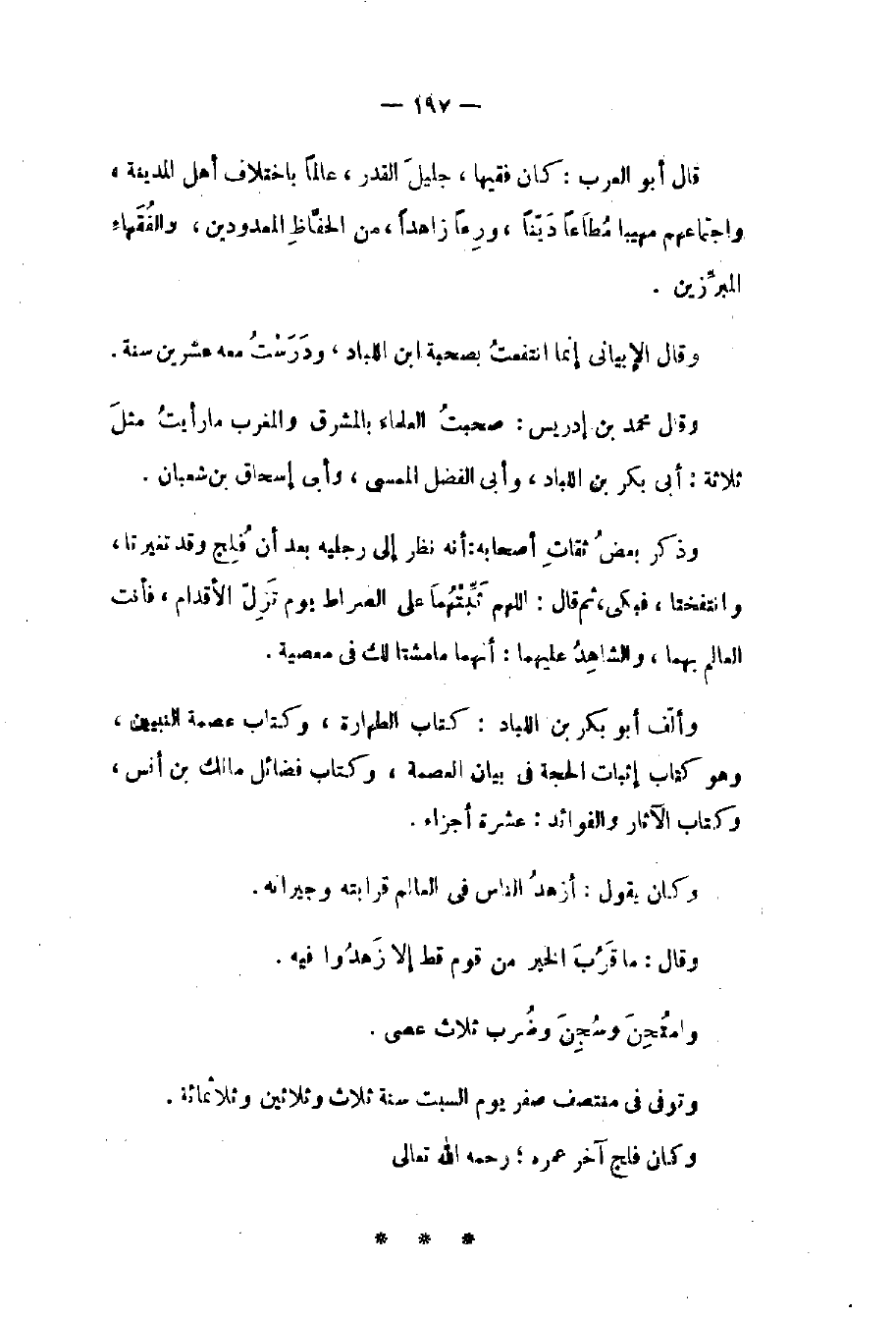وكان يقول: أزهد الناس في العلم قرابته وجيرانه. وقال: ما قرب الخير من قوم قط إلا زهدوا فيه. وامتحن وسجن وضرب ثلاث عصي. وتوفي في منتصف صفر يوم السبت سنة ثلاث وثلاثين وثلاثمائة. وكان فلج آخر عمره رحمه الله تعالى.