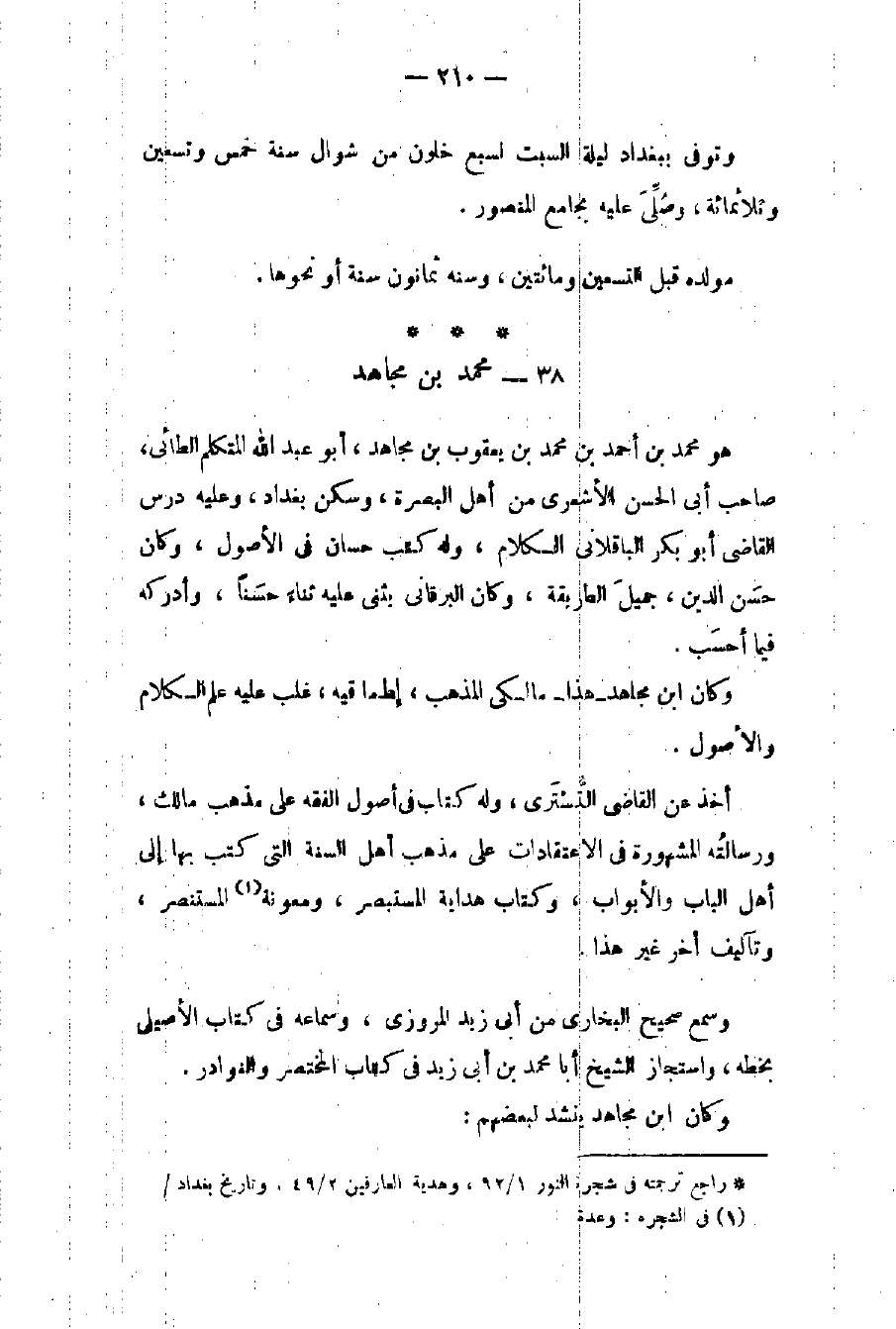 وكان بن مجاهد - هذا - مالكي المذهب إماماً فيه غلب عليه علم الكلام والأصول أخذ عن القاضي التستري وله كتاب في أصول الفقه على مذهب مالك ورسالته المشهورة في الاعتقادات على مذهب أهل السنة التي كتب بها إلى أهل الباب والأبواب وكتاب هداية المستبصر ومعونة المستنصر وتآليف أخر غير هذا.