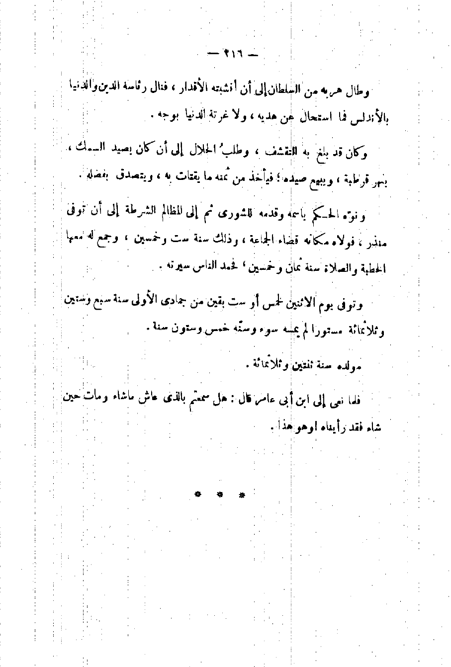 ونوه الحكم باسمه وقدمه للشورى ثم إلى المظالم الشرطة إلى أن توفي منذر فولاه مكانه قضاء الجماعة وذلك سنة ست وخمسين وجمع له معها الخطبة والصلاة سنة ثمان وخمسين فحمد الناس سيرته. وتوفي يوم الاثنين لخمس أو ست بقين من جمادى الأولى سنة سبع وستين وثلاثمائة مستوراً لم يمسه سوء وسنه خمس وستون سنة. مولده سنة ثنتين وثلاثمائة فلما نعي إلى بن أبي عامر قال: هل سمعتم الذي عاش ما شاء ومات حين شاء فقد رأيناه وهو هذا.