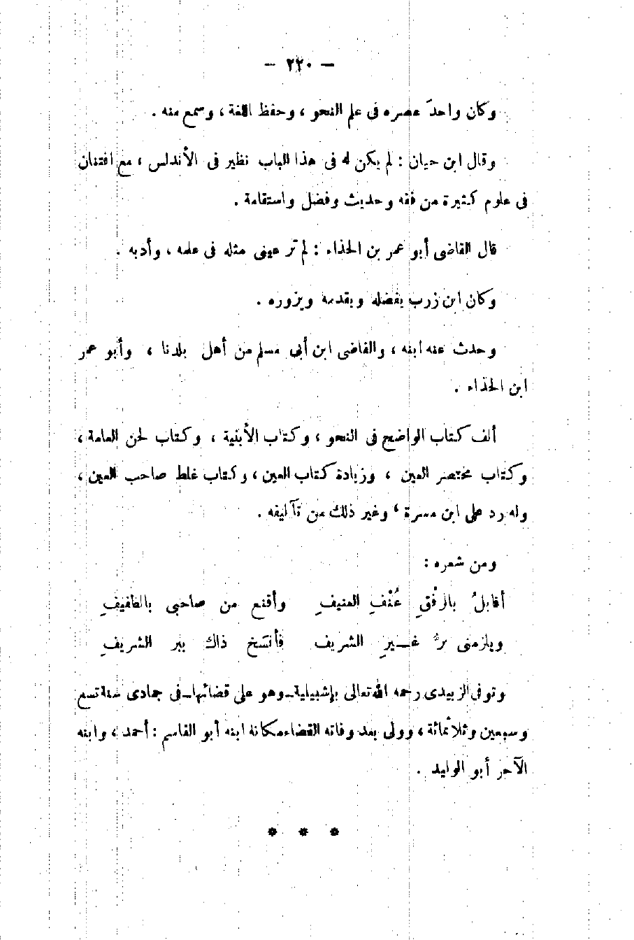 وكان واحد عصره في علم النحو وحفظ اللغة وسمع منه. وقال بن حيان: لم يكن له في هذا الباب نظير في الأندلس مع افتنان في علوم كثيرة من فقه وحديث وفضل واستقامة. قال القاضي أبو عمر بن الحذاء: لم تر عيني مثله في علمه وأدبه وكان بن زرب يفضله ويقدمه ويزوره وحدث عنه ابنه والقاضي بن أبي مسلم من أهل بلدنا وأبو عمر بن الحذاء.