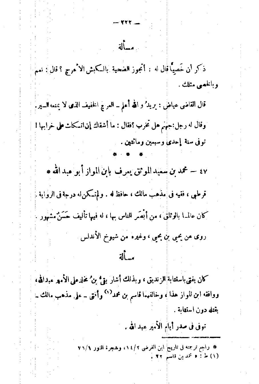 مسألة: كان يفتي باستتابة الزنديق وبذلك أشار بقي بن مخلد على الأمير عبد الله ووافقه بن المواز هذا وخالفهما قاسم بن محمد وأفتى - على مذهب مالك - بقتله دون استتابة. توفي في صدر أيام الأمير عبد الله.