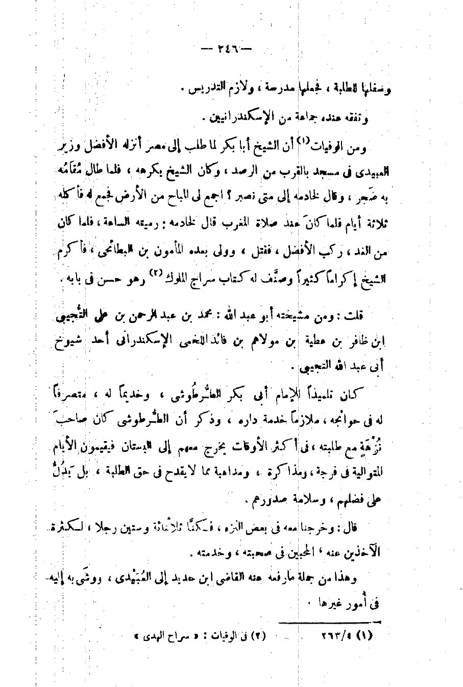 ومن الوفيات أن الشيخ أبا بكر لما طلب إلى مصر أنزله الأفضل وزير العبيدي في مسجد بالقرب من الرصد وكان الشيخ يكرهه فلما طال مقامه به ضجر وقال لخادمه: إلى متى نصبر؟ اجمع لي المباح من الأرض فجمع له فأكله ثلاثة أيام فلما كان عند صلاة المغرب قال لخادمه: رميته الساعة فلما كان من الغد ركب الأفضل فقتل وولي بعده المأمون بن البطائحي فأكرم الشيخ إكراماً كثيراً وصنف له كتاب سراج الملوك وهو حسن في بابه.