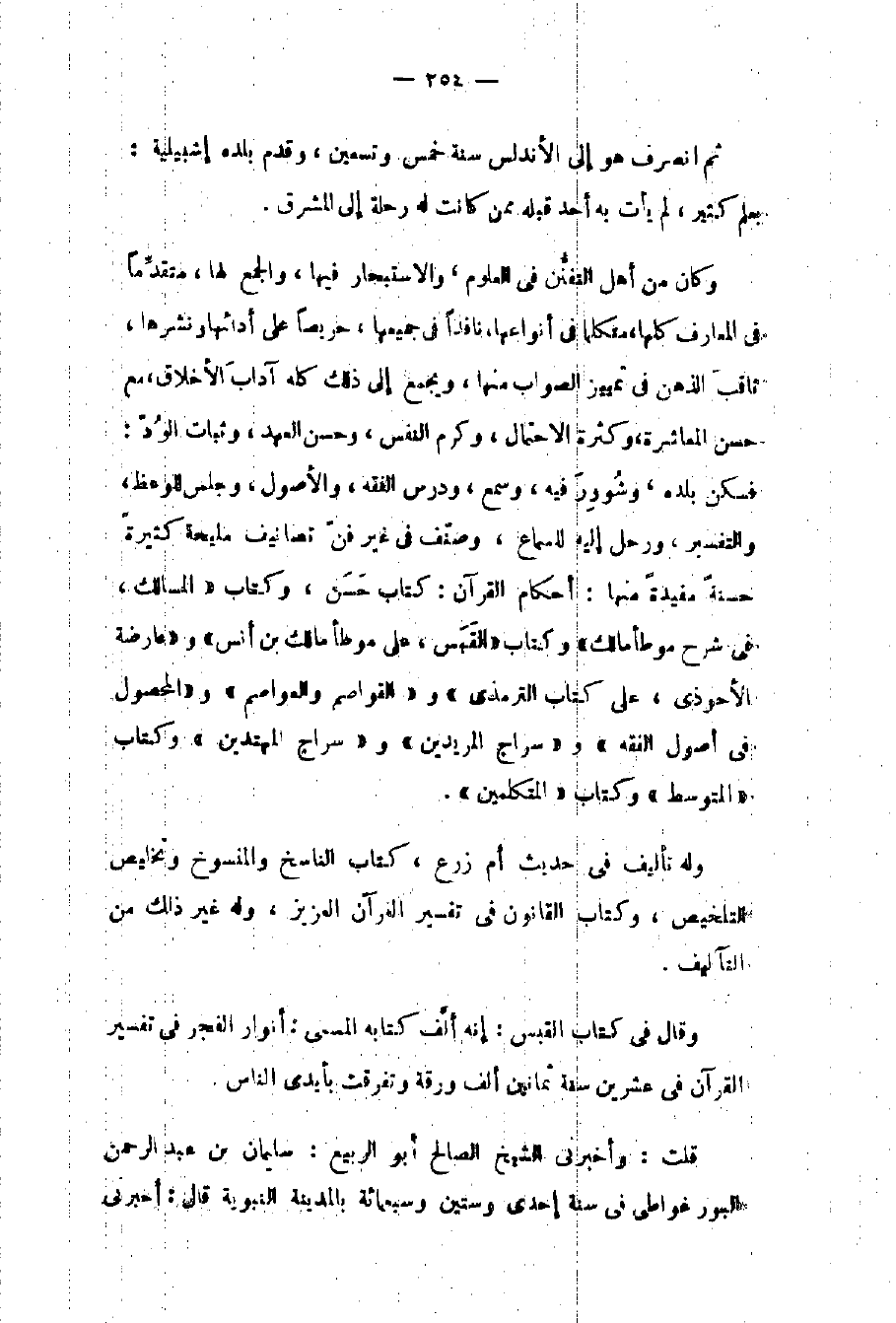 وكان من أهل التفنن في العلوم والاستبحار فيها والجمع له متقدماً في المعارف كلها متكلماً في أنواعها نافذاً في جميعها حريصاً على أدائها ونشرها ثاقب الذهن في تمييز الصواب منها ويجمع إلى ذلك كله آداب الأخلاق مع حسن المعاشرة وكثرة الاحتمال وكرم النفس وحسن العهد وثبات الود: فسكن بلده وشوور فيه وسمع ودرس الفقه والأصول وجلس للوعظ والتفسير ورحل إليه للسماع وصنف في غير فن تصانيف مليحة كثيرة حسنة مفيدة منها: أحكام القرآن كتاب حسن وكتاب المسالك في شرح موطأ مالك وكتاب القبس على موطأ مالك بن أنس وعارضة الأحوذي على كتاب الترمذي والقواصم والعواصم والمحصول في أصول الفقه وسراج المريدين وسراج المهتدين وكتاب المتوسط وكتاب المتكلمين.