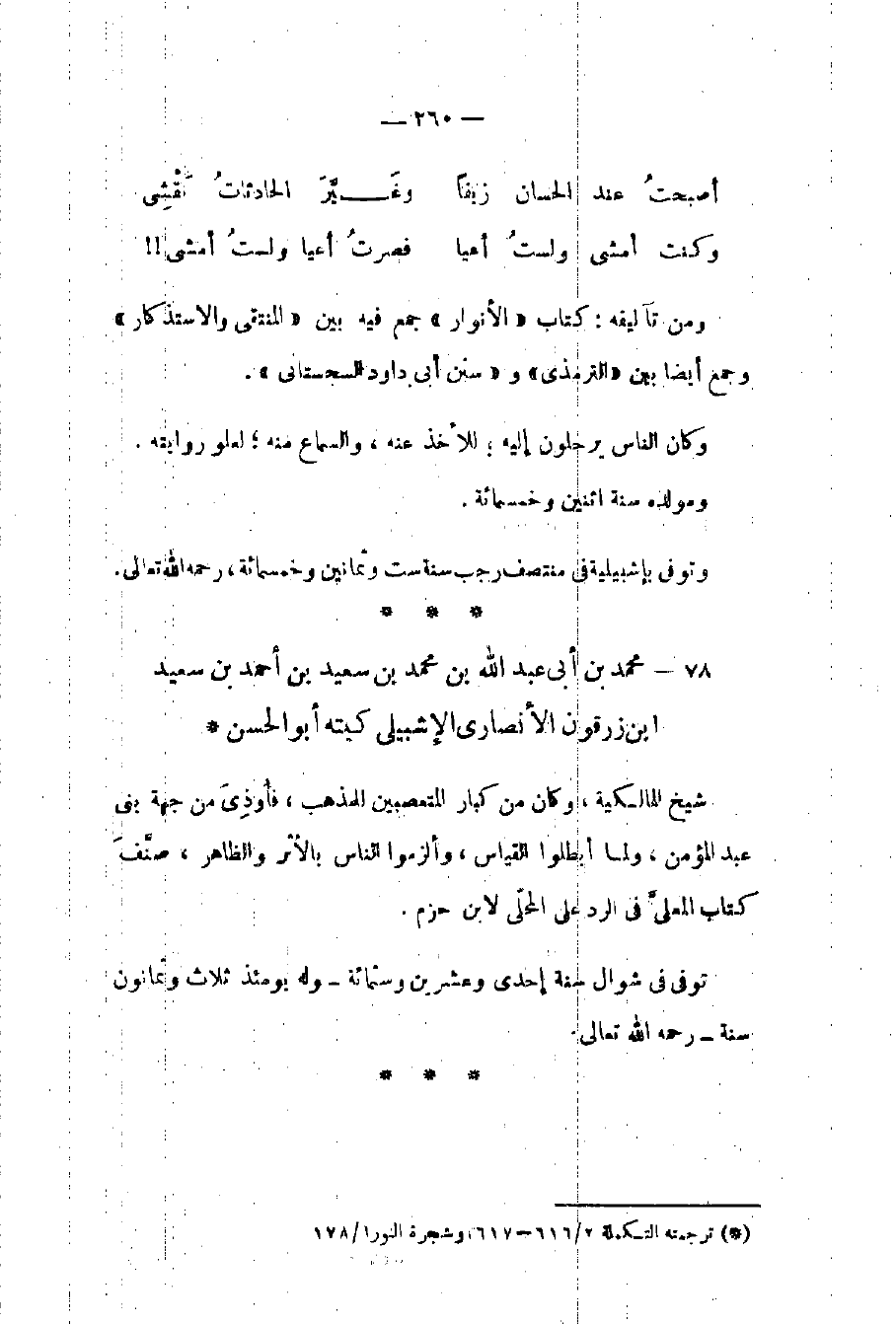 ومن تآليفه: كتاب الأنوار جمع فيه بين المنتقى والاستذكار وجمع أيضاً بين الترمذي وسنن أبي داود السجستاني. وكان الناس يرحلون إليه للأخذ عنه والسماع منه لعلو روايته. ومولده سنة اثنين وخمسمائة. وتوفي بإشبيلية في منتصف رجب سنة ست وثمانين وخمسمائة رحمه الله تعالى.