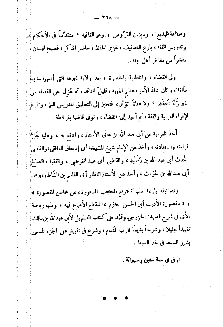وصناعة البديع وميزان العروض وعلم القافية متقدماً في الأحكام وتدريس الفقه بارع التصنيف غزير الحفظ حاضر الذكر فصيح اللسان مفخراً من مفاخر أهل بيته.