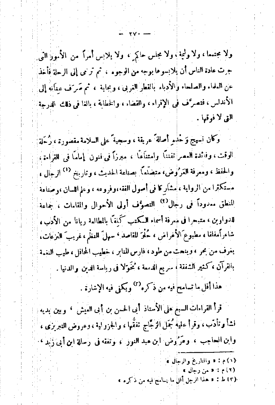 وكان نسيح وحده أصالة عريقة وسجية على السلامة مقصورة رحلة الوقت وفائدة العصر تفنناً وامتناعاً مبرزاً في فنون إماماً في القراءة والحفظ ومعرفة العروض متضلعاً بصناعة الحديث وتاريخ الرجال مستكثراً من الرواية مشاركاً في أصول الفقه وفروعه وعلم اللسان وصناعة المنطق معدوداً في رجال التصوف أولي الأحوال والمقامات جماعة للدواوين متبحراً في معرفة أسماء الكتب كلفاً بالمطالعة رياناً من الأدب شاعراً مفلقاً مطبوع الأغراض حلو المقاصد سهل النظم غريب النزعات يغرف من بحر وينحت من طود فارس المنابر خطيب المحافل طيب النغمة بالقرآن كثير الشفقة سريع الدمعة مخولاً في رياسة الدين والدنيا. هذا أقل ما تسامح فيه من ذكره ويكفي فيه الإشارة.
