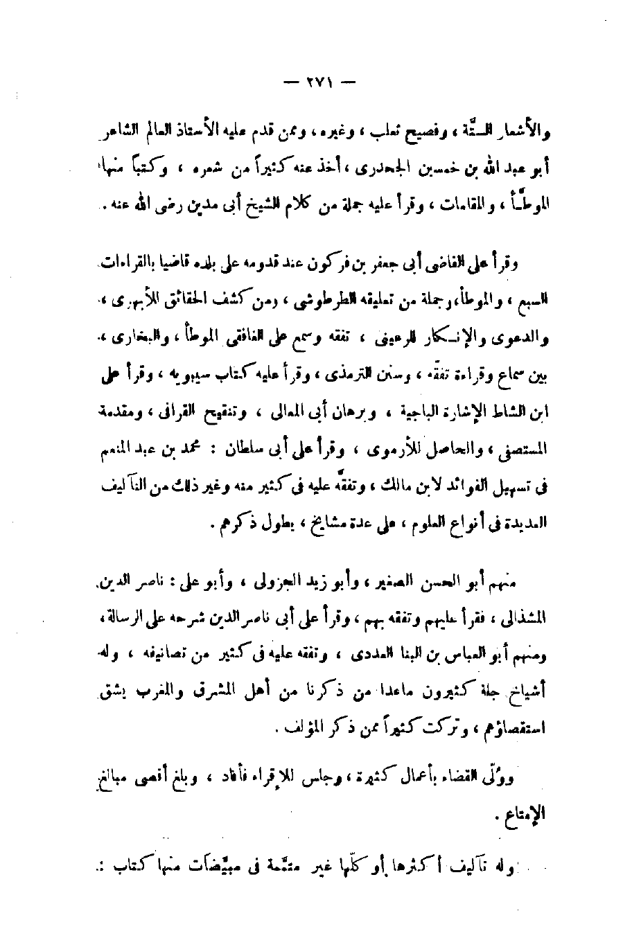 منهم أبو الحسن الصغير وأبو زيد الجزولي وأبو علي: ناصر الدين المشذالي فقرأ عليهم وتفقه بهم وقرأ على أبي ناصر الدين شرحه على الرسالة ومنهم أبو العباس بن البنا العددي وتفقه عليه في كثير من تصانيفه وله أشياخ جلة كثيرون ما عدا من ذكرنا من أهل المشرق والمغرب يشق استقصاؤهم وتركت كثيراً ممن ذكر المؤلف. وولي القضاء بأعمال كثيرة وجلس للإقراء فأفاد وبلغ أقصى مبالغ الإمتاع.