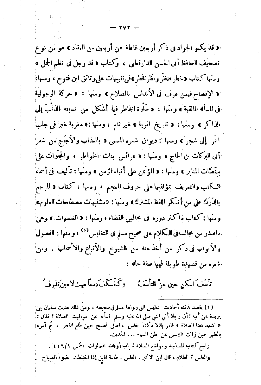 قد يكبو الجواد في ذكر أربعين غلطة عن أربعين من النقاد هو من نوع تصحيف الحافظ أبي الحسن الدارقطني وكتاب قد وجل في نظم الجمل ومنها كتاب خطر فنظر ونظر فخطر في تنبيهات على وثائق بن فتوح ومنها: الإفصاح فيمن عرف في الأندلس بالصلاح ومنها: حركة الرجولية في المسألة المالقية ومنها: سلوة الخاطر فيما أشكل من نسبته الذنب إلى الذاكر ومنها: تاريخ المرية غير تام ومنها: مغربة خبر في جلب التمر إلى شجر ومنها: ديوان شعره المسمى بالعذاب والأجاج من شعر أبي البركات بن الحاج ومنها: عرائس بنات الخواطر والمجلوات على منصات المنابر ومنها: المؤتمن على أنباء الزمن ومنها تأليف في أسماء الكتب والتعريف بمؤلفيها على حروف المعجم ومنها: كتاب المرجع بالدرك على من أنكر اللفظ المشترك ومنها: مشتبهات مصطلحات العلوم ومنها: كتاب ما كثر دوره في مجالس القضاء ومنها: الغلسيات وهي ما صدر من مجالسه في الكلام على صحيح مسلم في التغليس ومنها: الفصول والأبواب في ذكر من أخذ عنه من الشيوخ والأتباع والأصحاب.