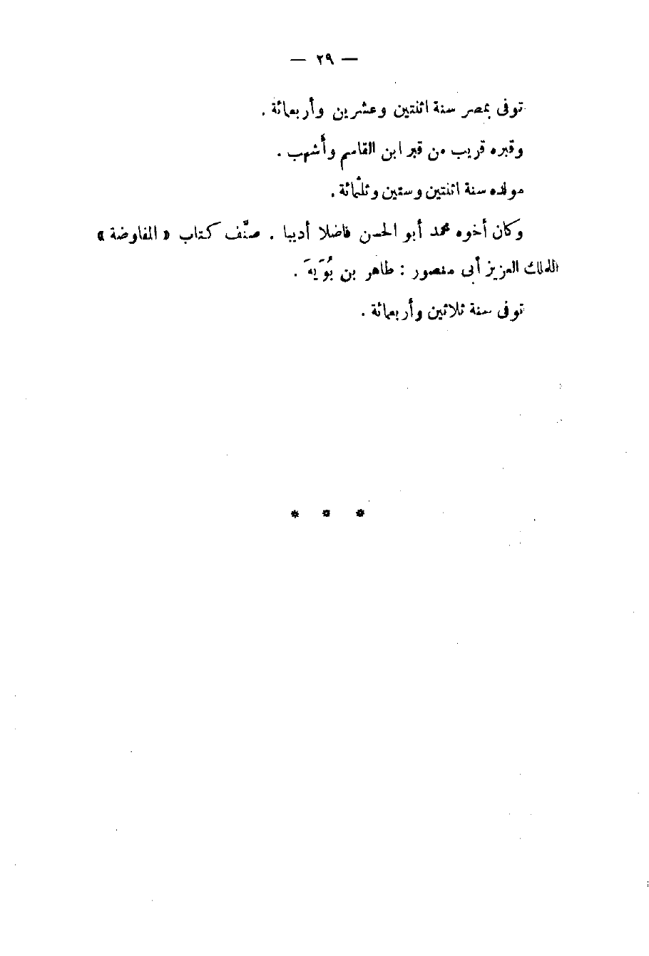 توفي بمصر سنة اثنتين وعشرين وأربعمائة وقبره قريب من قبر بن القاسم وأشهب. مولده سنة اثنتين وستين وثلاثمائة وكان أخوه محمد أبو الحسن فاضلاً أديباً صنف كتاب المفاوضة للملك العزيز أبي منصور: طاهر بن بويه. توفي سنة ثلاثين وأربعمائة.