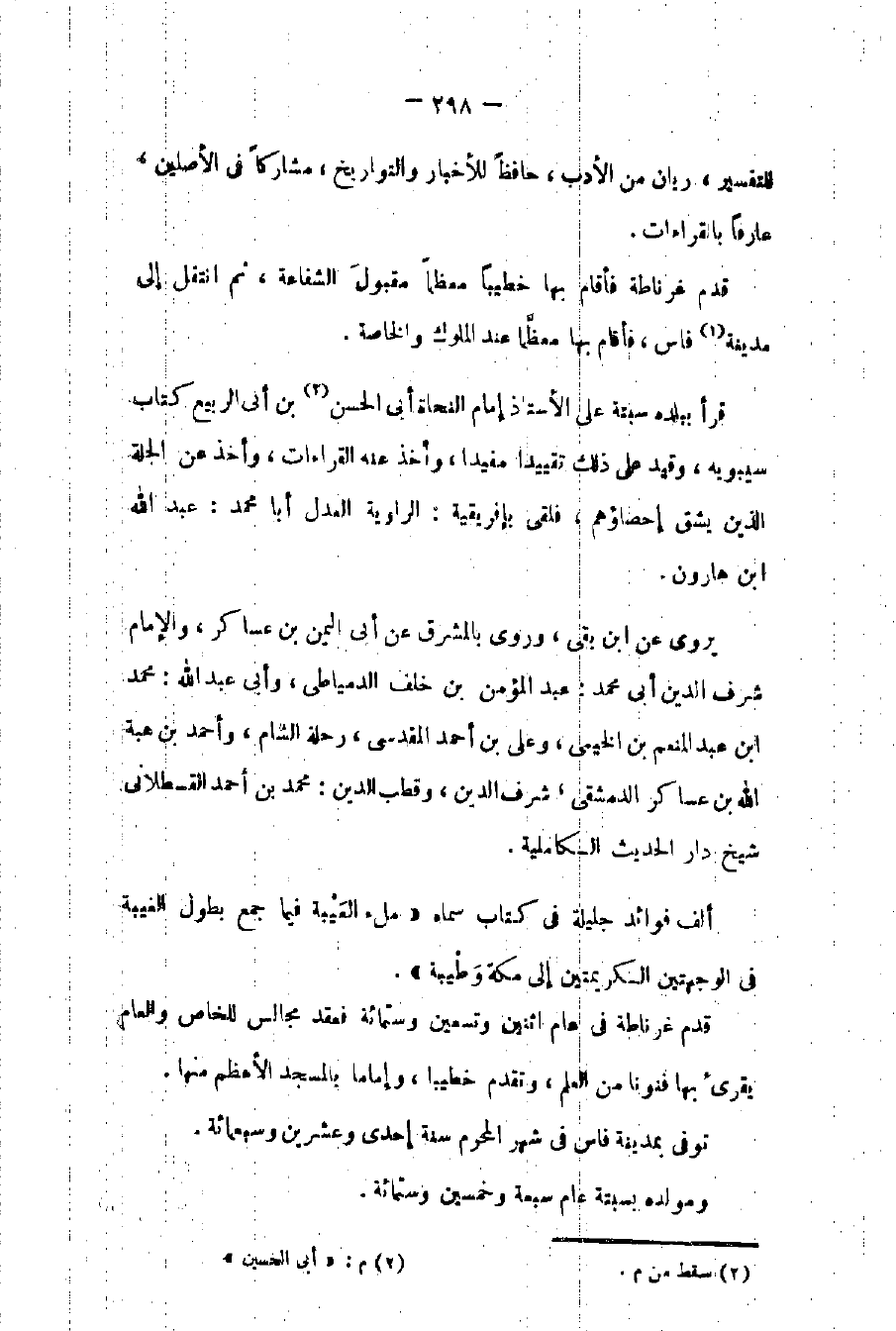 للتفسير ريان من الأدب حافظاً للأخبار والتواريخ مشاركاً في الأصلين عارفاً بالقراءات. قدم غرناطة فأقام بها خطيباً معظماً مقبول الشفاعة ثم انتقل إلى مدينة فاس فأقام بها معظماً عند الملوك والخاصة. قرأ ببلده سبتة على الأستاذ إمام النحاة أبي الحسن بن أبي الربيع كتاب سيبويه وقيد على ذلك تقييداً مفيداً وأخذ عنه القراءات وأخذ عنه الجلة الذين يشق إحصاؤهم فلقي بإفريقية: الراوية العدل أبا محمد: عبد الله بن هارون.