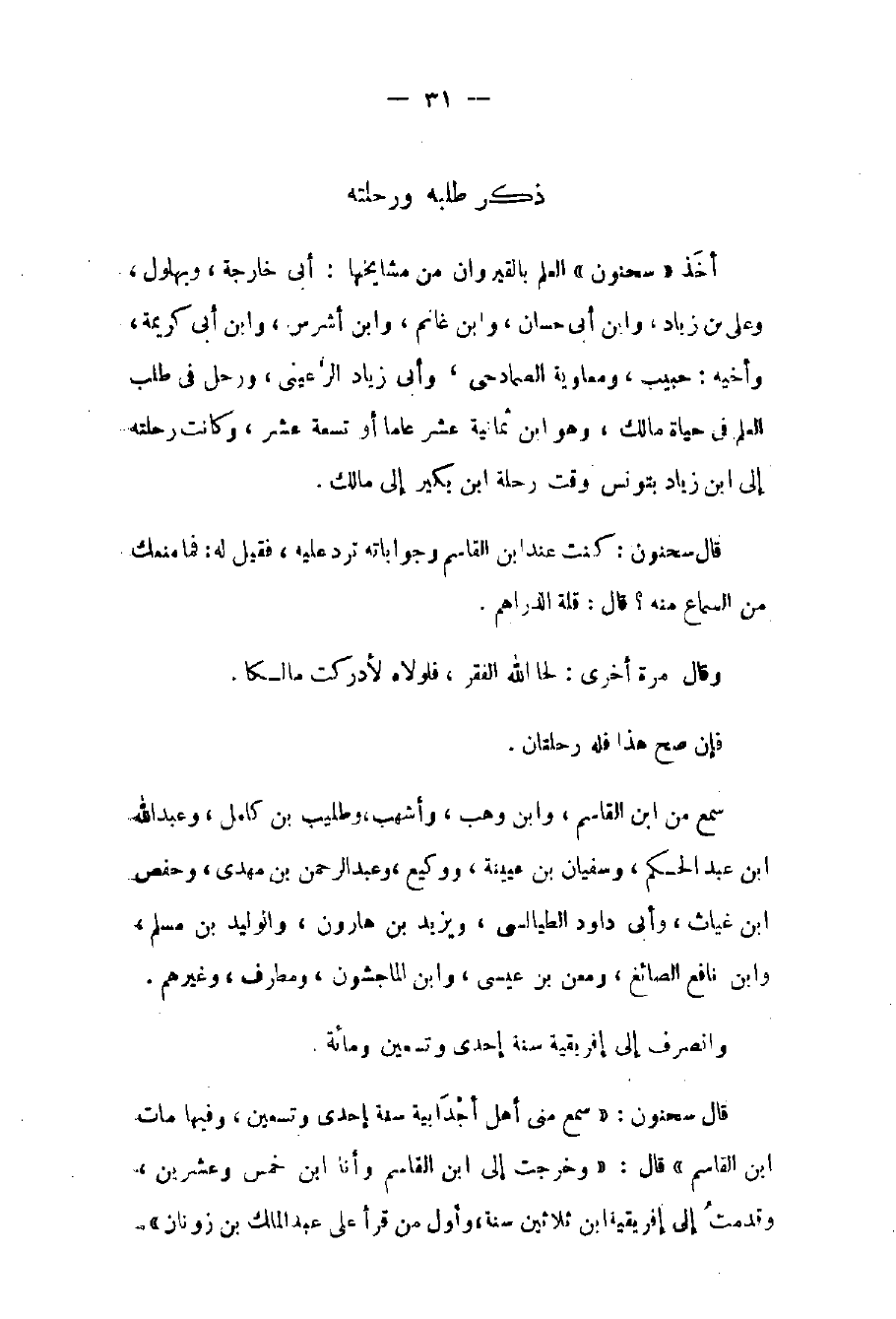 ذكر طلبه ورحلته: أخذ سحنون العلم بالقيروان من مشايخها: أبي خارجة وبهلول وعلي بن زياد وابن أبي حسان وابن غانم وابن أشرس وابن أبي كريمة وأخيه: حبيب ومعاوية الصمادحي وأبي زياد الرعيني ورحل في طلب العلم في حياة مالك وهو بن ثمانية عشر عاماً أو تسعة عشر وكانت رحلته إلى بن زياد بتونس وقت رحلة بن بكير إلى مالك.