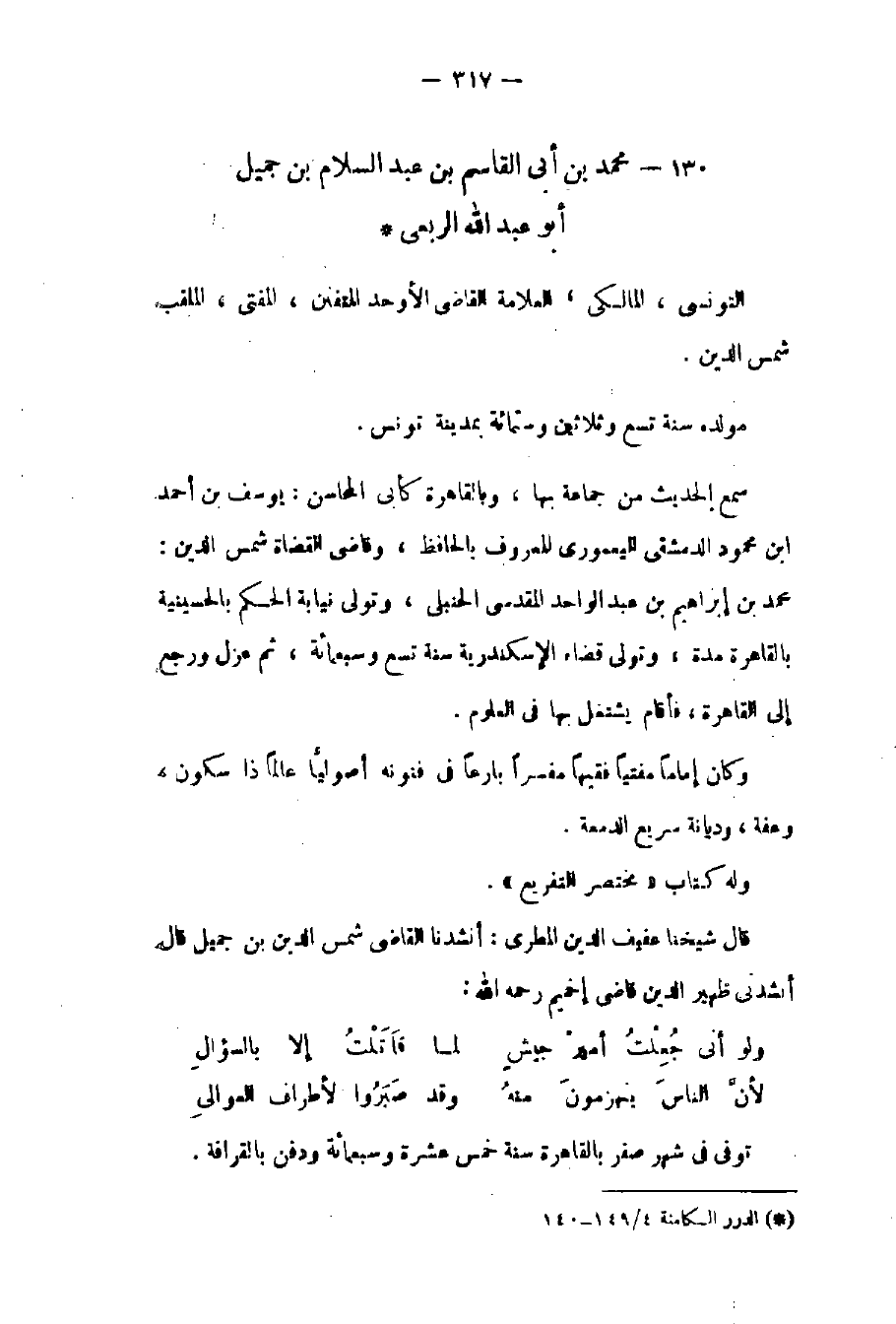التونسي المالكي العلامة القاضي الأوحد المتفنن المفتي الملقب شمس الدين. مولده سنة تسع وثلاثين وستمائة بمدينة تونس. سمع الحديث من جماعة بها وبالقاهرة كأبي المحاسن يوسف بن أحمد بن محمود الدمشقي اليعموري المعروف بالحافظ وقاض القضاة شمس الدين: محمد بن إبراهيم بن عبد الواحد المقدسي الحنبلي وتولى نيابة الحكم بالحسينية بالقاهرة مدة: وتولى قضاء الإسكندرية سنة تسع وسبعمائة ثم عزل ورجع إلى القاهرة فأقام يشتغل بها في العلوم وكان إماماً مفتياً فقيهاً مفسراً بارعاً في فنونه أصولياً عالماً ذا سكون وعفة وديانة سريع الدمعة. وله كتاب مختصر التفريع. قال شيخنا عفيف الدين المطري: أنشدنا القاضي شمس الدين بن جميل قال: أنشدني ظهير الدين قاضي إخميم رحمه الله: