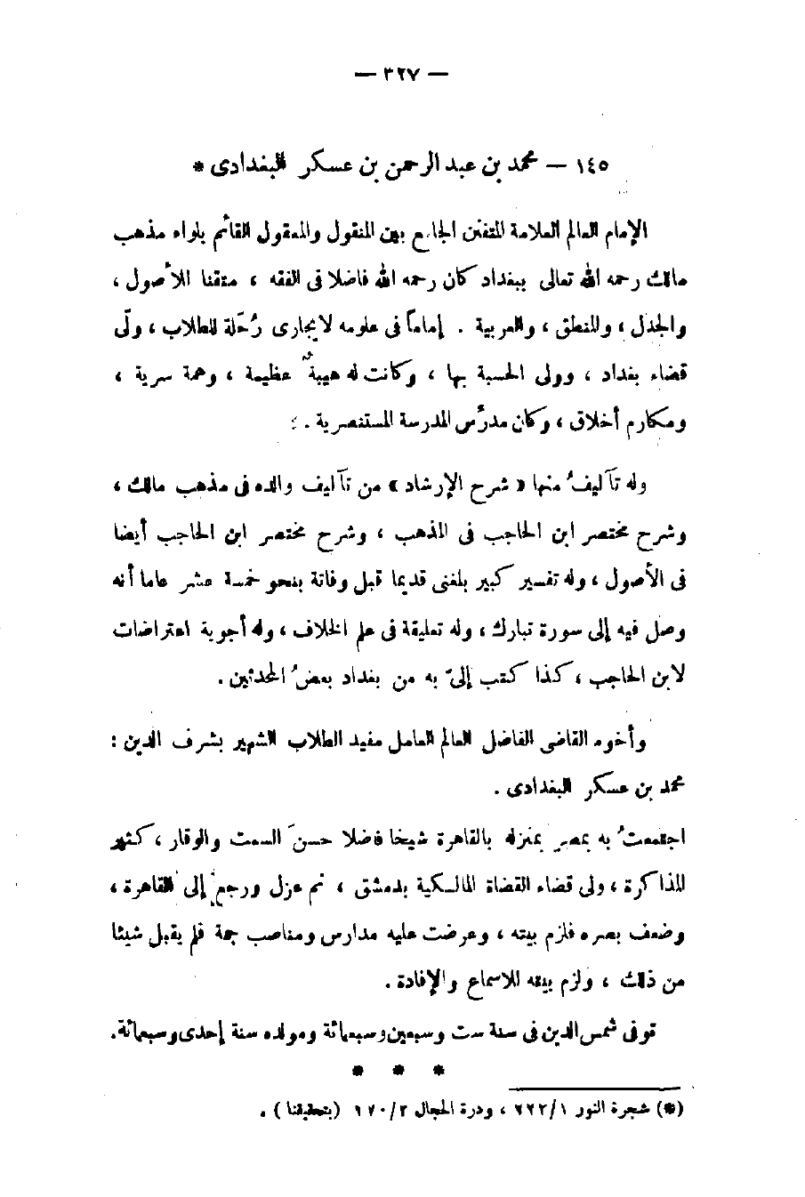 وأخوه القاضي الفاضل العالم العامل مفيد الطلاب الشهير بشمس الدين: محمد بن عسكر البغدادي. اجتمعت به بمصر بمنزله بالقاهرة شيخاً فاضلاً حسن السمت والوقار كثير المذاكرة ولي قضاء القضاة المالكية بدمشق ثم عزل ورجع إلى القاهرة وضعف بصره فلزم بيته وعرضت عليه مدارس ومناصب جمة فلم يقبل شيئاً من ذلك ولزم بيته للإسماع والإفادة.