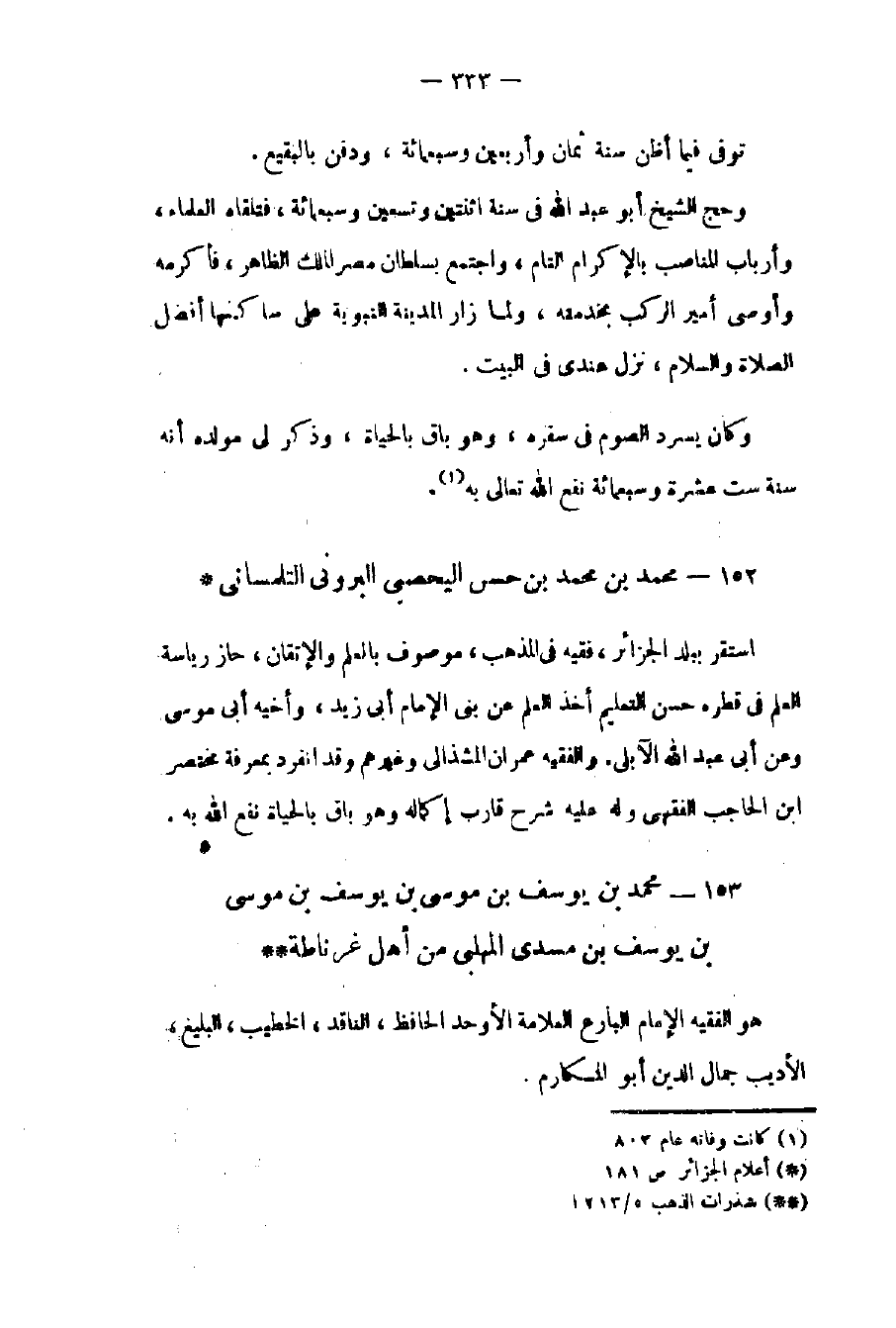 وحج الشيخ أبو عبد الله في سنة اثنتين وتسعين وسبعمائة فتلقاه العلماء وأرباب المناصب بالإكرام التام واجتمع بسلطان مصر الملك الظاهر فأكرمه وأوصى أمير الركب بخدمته ولما زار المدينة النبوية على ساكنها أفضل الصلاة والسلام نزل عندي في البيت. وكان يسرد الصوم في سفره وهو باق بالحياة وذكر لي مولده أنه سنة ست عشرة وسبعمائة نفع الله تعالى به.