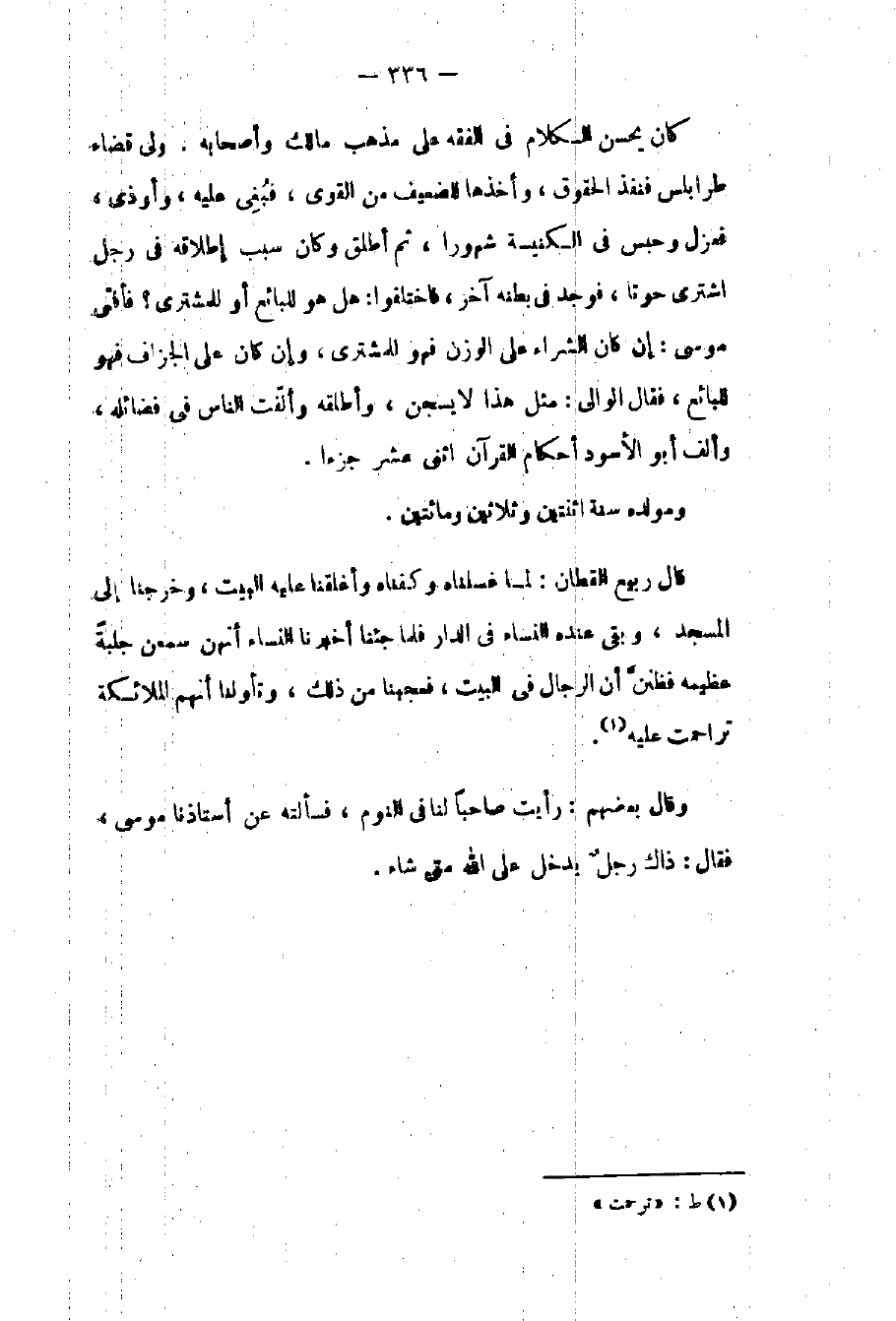 كان يحسن الكلام في الفقه على مذهب مالك وأصحابه ولي قضاء طرابلس فنفذ الحقوق وأخذها للضعيف من القوي فبغي عليه وأوذي فعزل وحبس في الكنيسة شهوراً ثم أطلق وكان سبب إطلاقه في رجل اشترى حوتاً فوجد في بطنه آخر فاختلفوا: هل هو للبائع أو للمشتري؟ فأفتى موسى: إن كان الشراء على الوزن فهو للمشتري وإن كان على الجزاف فهو للبائع فقال الوالي: مثل هذا لا يسجن وأطلقه وألفت الناس في فضائله وألف أبو الأسود أحكام القرآن اثني عشر جزءاً. وتوفي في ذي القعدة سنة ست وثلاثمائة وهو بن إحدى وسبعين سنة ومولده سنة اثنتين وثلاثين ومائتين.