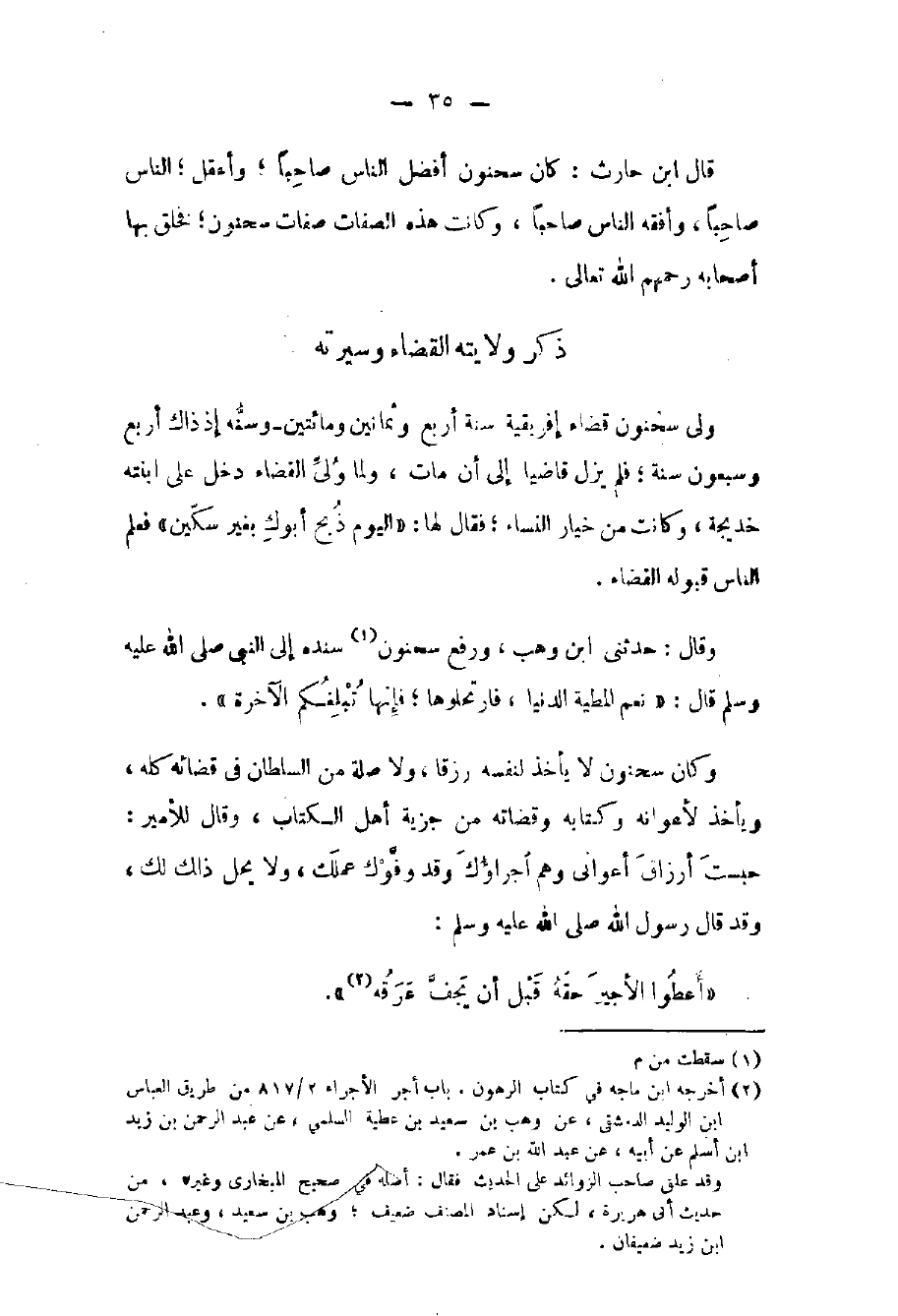 وقال: حدثني بن وهب ورفع سحنون سنده إلى النبي صلى الله عليه وسلم قال: " نعم المطية الدنيا فارتحلوها فإنها تبلغكم الآخرة ". وكان سحنون لا يأخذ لنفسه رزقاً ولا صلة من السلطان في قضائه كله ويأخذ لأعوانه وكتابه وقضاته من جزية أهل الكتاب وقال للأمير: حبست أرزاق أعواني وهم أجراؤك وقد وفوك عملك ولا يحل ذلك لك وقد قال رسول الله صلى الله عليه وسلم: " أعطوا الأجير حقه قبل أن يجف عرقه ".