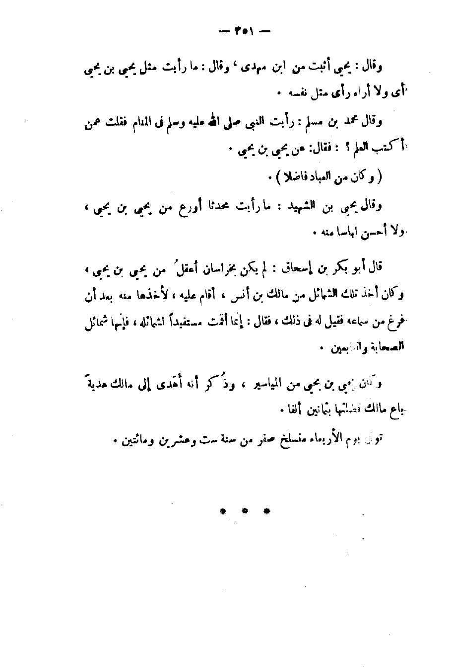 وقال: يحيى أثبت من بن مهدي وقال: ما رأيت مثل يحيى بن يحيى أي ولا أراه رأى مثل نفسه. وقال محمد بن مسلمة: رأيت النبي صلى الله عليه وسلم في المنام فقلت: عمن أكتب العلم؟ فقال: " عن يحيى بن يحيى ". وكان من العباد فاضلاً. وقال يحيى بن الشهيد: ما رأيت محدثاً أورع من يحيى بن يحيى ولا أحسن لباساً منه.