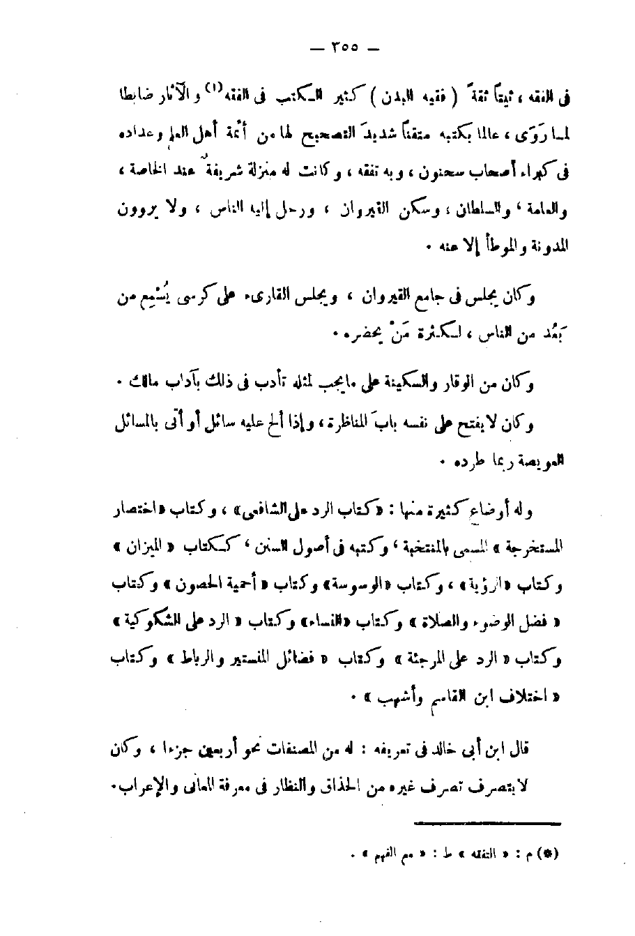 في الفقه ثبتاً ثقة فقيه البدن كثير الكتب في التفقه والآثار ضابطاً لما روى عالماً بكتبه متقناً شديد التصحيح لها من أئمة أهل العلم وعداده في كبراء أصحاب سحنون وبه تفقه وكانت له منزلة شريفة عند الخاصة والعامة والسلطان. وسكن القيروان ورحل إليه الناس ولا يروون المدونة والموطأ إلا عنه. وكان يجلس في جامع القيروان ويجلس القارئ على كرسي يسمع من بعد من الناس لكثرة من يحضره وكان من أهل الوقار والسكينة على ما يجب لمثله تأدب في ذلك بآداب مالك. وكان لا يفتح على نفسه باب المناظرة وإذا ألح عليه سائل أو أتي بالمسائل العويصة ربما طرده.