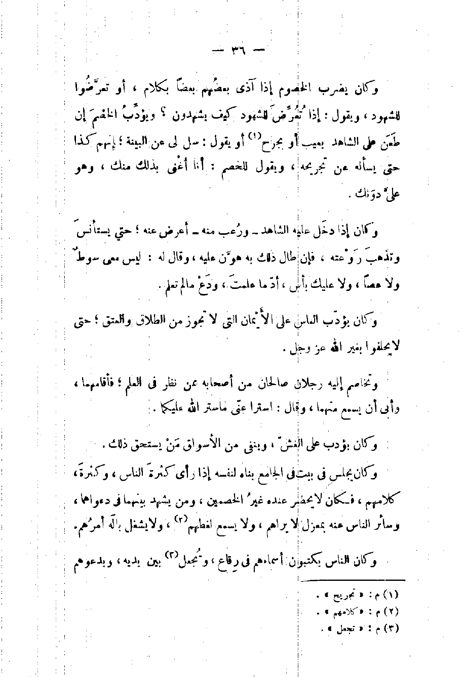 وكان يضرب الخصوم إذا أذى بعضهم بعضاً بكلام أو تعرضوا للشهود ويقول: إذا تعرض للشهود كيف يشهدون؟ ويؤدب الخصم إن طعن على الشاهد بعيب أو تجريح أو يقول: سل لي عن البينة إنهم كذا حتى يسئله عن تجريحه ويقول للخصم: أنا أغنى بذلك منك وهو علي دونك.
