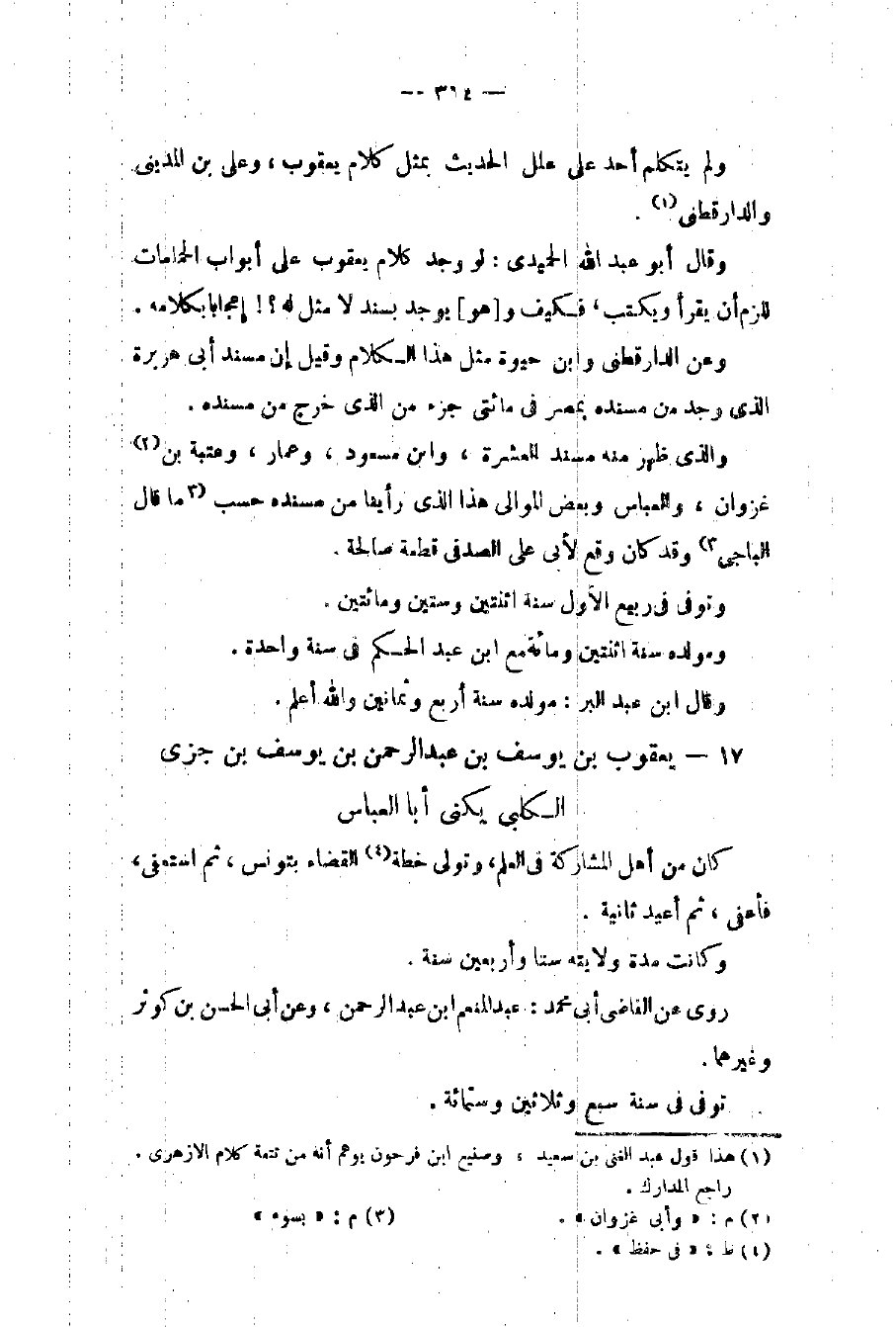 وقال أبو عبد الله الحميدي: لو وجد كلام يعقوب على أبواب الحمامات للزم أن يقرأ ويكتب فكيف ويوجد سند لا مثل له؟ إعجاباً بكلامه وعن الدارقطني وابن حيوة مثل هذا الكلام وقيل إن مسند أبي هريرة الذي وجد من مسنده بمصر في مائتي جزء من الذي خرج من مسنده. والذي ظهر منه مسند العشرة وابن مسعود وعمار وعتبة بن غزوان والعباس وبعض الموالي هذا الذي رأينا من مسنده حسب ما قال الباجي وقد كان وقع لأبي علي الصدفي قطعة صالحة. وتوفي في ربيع الأول سنة اثنتين وستين ومائتين. ومولده سنة اثنتين ومائة مع بن عبد الحكم في سنة واحدة. وقال بن عبد البر: مولده سنة أربع وثمانين والله أعلم.