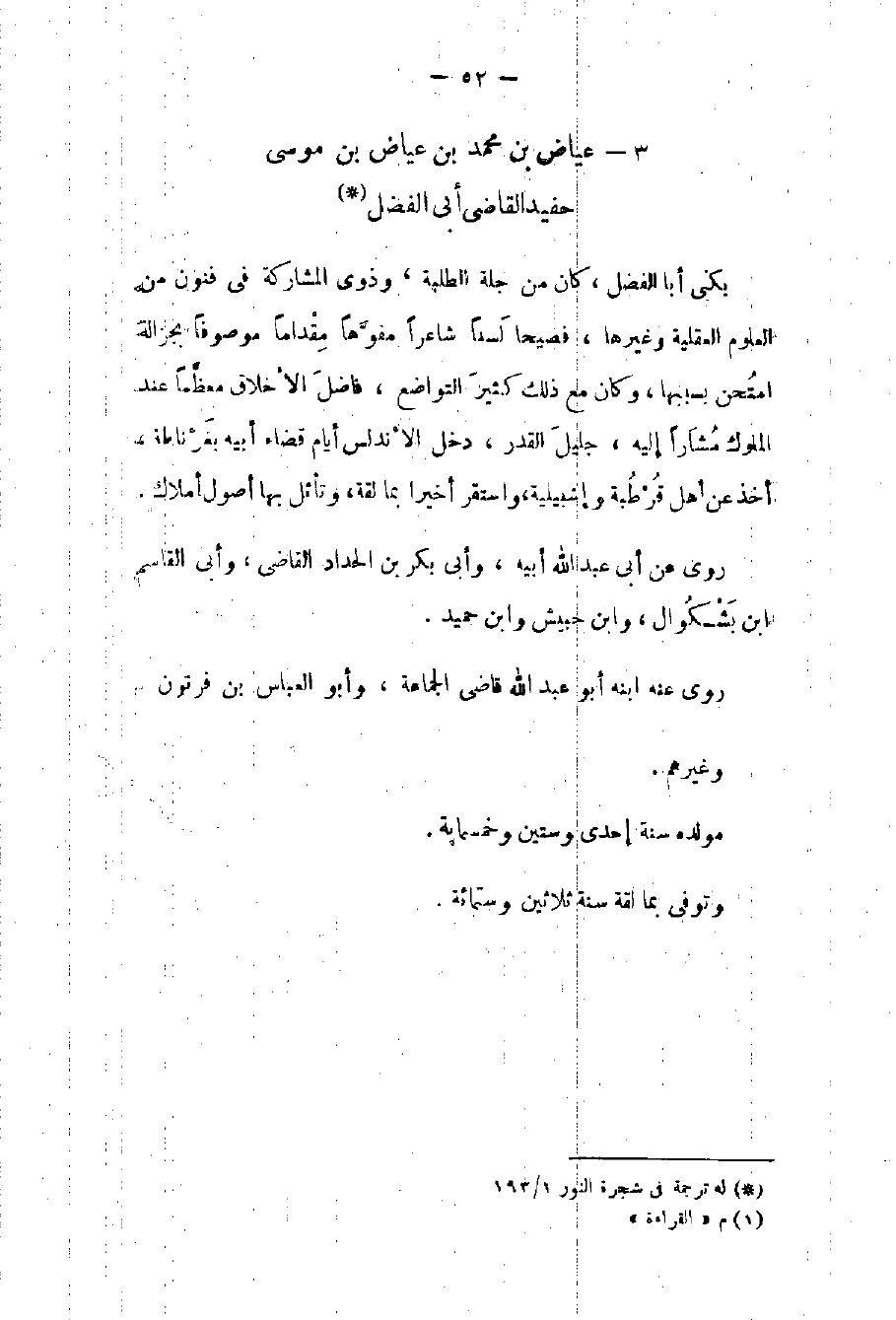 يكنى أبا الفضل كان من جلة الطلبة وذوي المشاركة في فنون من العلوم العقلية وغيرها فصيحاً لسناً شاعراً مفوهاً مقداماً موصوفاً بجزالة امتحن بسببها وكان مع ذلك كثير التواضع فاضل الأخلاق معظماً عند الملوك مشاراً إليه جليل القدر دخل الأندلس أيام قضاء أبيه بغرناطة وأخذ عن أهل قرطبة وإشبيلية واستقر أخيراً بمالقة وتأهل بها أصول أملاك.