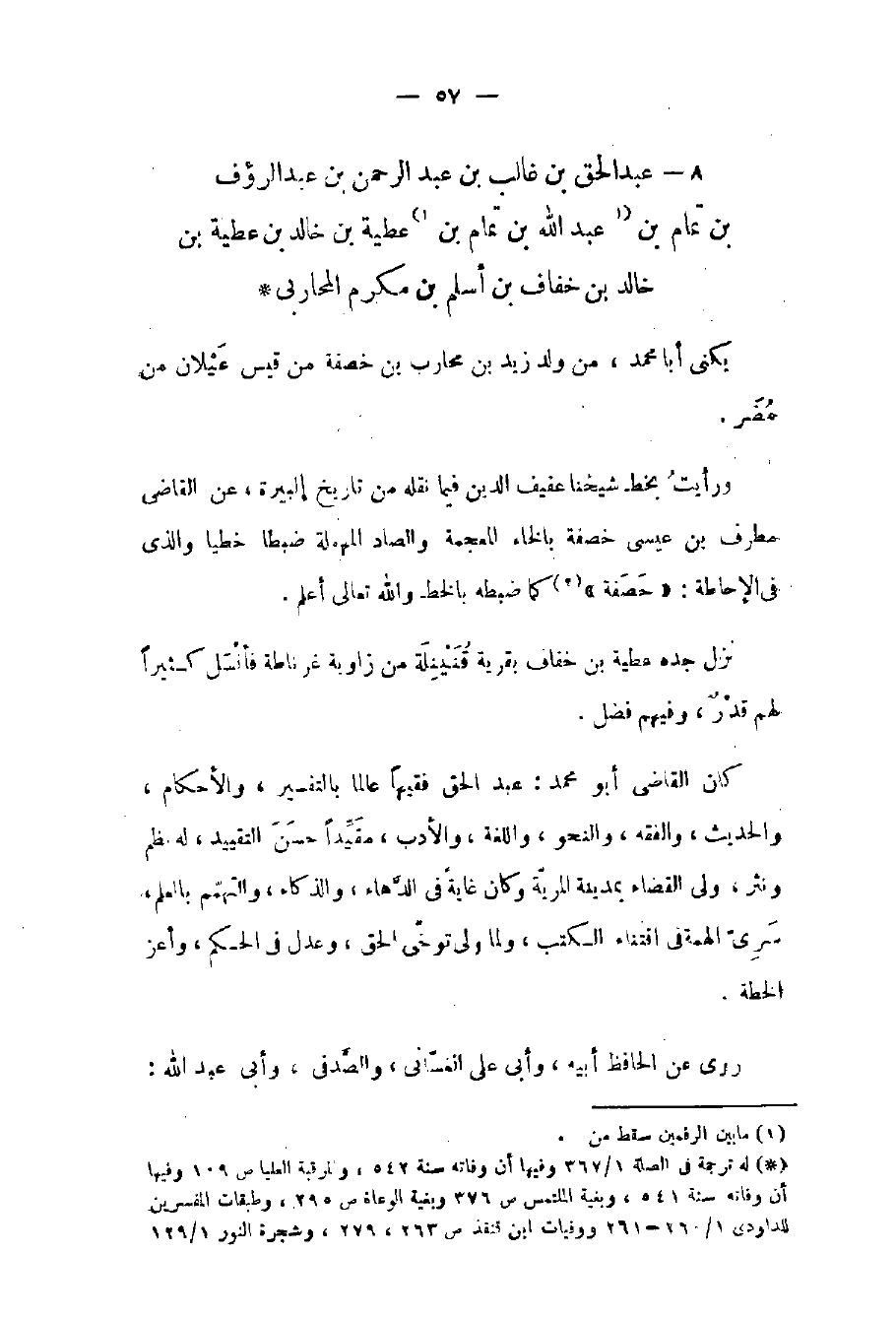 بن عبد الرحمن! به غبد الرؤوف بن تمام بن عبد الله بن تمام بن عطية بن خالد بن عطية بن خالد بن خفاف بن أسلم بن مكرم المحاربي يكنى أبا محمد من ولد زيد بن محارب بن خصفة من قيس عيلان من مضر. ورأيت بخط شيخنا عفيف الدين فيما نقله من تاريخ إلبيرة عن القاضي مطرف بن عيسى خصفة بالخاء المعجمة والصاد المهملة ضبطاً خطياً والذي في الإحاطة: حصفة كما ضبطه بالخط والله تعالى أعلم. نزل جده عطية بن خفاف بقرية قنينلة من زاوية غرناطة فأنسل كثيراً لهم قدر وفيهم فضل.