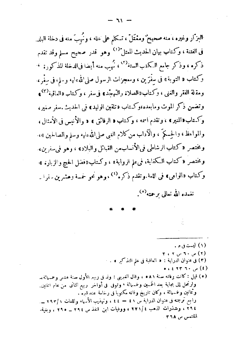 البزار وغيره منه صحيح ومعتل تكلم على علله ونهب منه في دخلة البلد في الفتنة وكتاب بيان الحديث المعتل وهو قدر صحيح مسلم وقد تقدم ذكره وذكر جامع الكتب الستة نهب منه أيضاً في الدخلة المذكورة وكتاب التوبة في سفرين ومعجزات الرسول صلى الله عليه وسلم في سفر ومقالة الفقر والغنى وكتاب الصلاة والتهجد في سفر وكتاب العاقبة وتضمن ذكر الموت وما بعده وكتاب تلقين الوليد في الحديث سفر صغير وكتاب المنير وتقدم اسمه وكتاب الرقائق والأنيس في الأمثال والمواعظ والحكم والآداب من كلام النبي صلى الله عليه وسلم والصالحين ومختصر كتاب الرشاطي في الأنساب من القبائل والبلاد وهو في سفرين ومختصر كتاب الكفاية في علم الرواية وكتاب فضل الحج والزيارة وكتاب الواعي في اللغة. وتقدم ذكره وهو نحو خمسة وعشرين سفراً. تغمده الله تعالى برحمته.