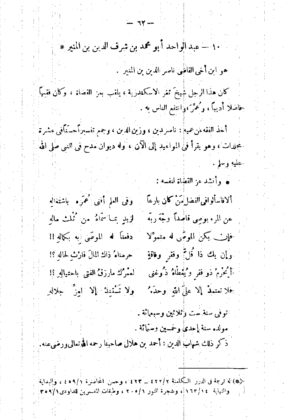 هو بن أخي القاضي ناصر الدين بن المنير. كان هذا الرجل شيخ ثغر الإسكندرية يلقب بعز القضاة وكان فقيهاً فاضلاً أديباً وعمر وانتفع الناس به أخذ الفقه عن عميه: ناصر الدين وزين الدين وجمع تفسيراً حسناً في عشرة مجلدات وهو يقرأ في المواعيد إلى الآن وله ديوان مدح في النبي صلى الله عليه وسلم. وأنشد عز القضاة لنفسه: