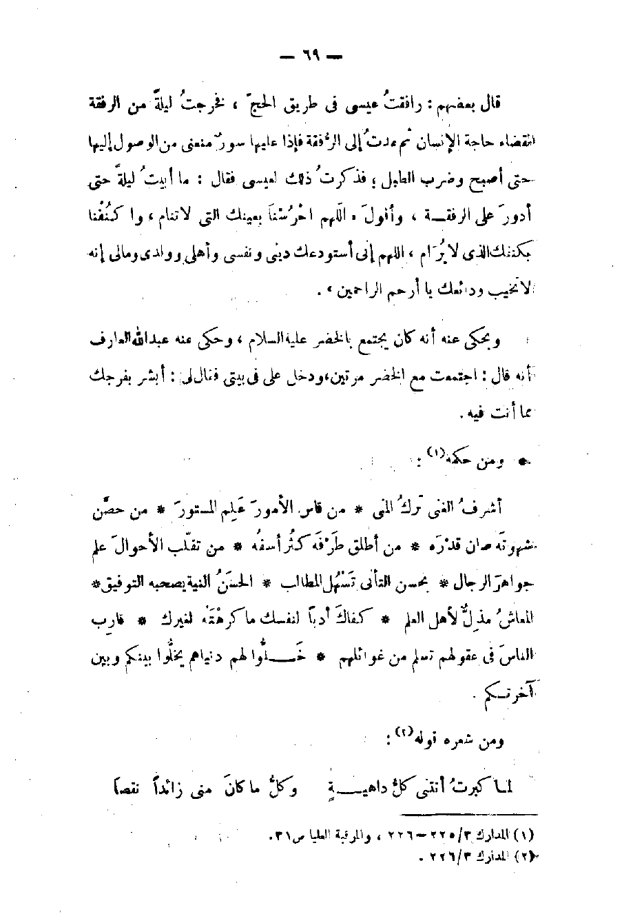 ويحكى عنه أنه كان يجتمع بالخضر عليه السلام وحكى عنه عبد الله العارف أنه قال: اجتمعت مع الخضر مرتين ودخل على في بيتي فقال لي: أبشر بفرجك مما أنت فيه. ومن حكمه: أشرف الغنى ترك المنى من قاس الأمور علم المستور من حصن شهوته صان قدره من أطلق طرفه كثر أسفه من تقلب الأحوال علم جواهر الرجال بحسن التأني تسهل المطالب الحسن النية يصحبه التوفيق المعاش مذل لأهل العلم كفاك أدباً لنفسك ما كرهته لغيرك قارب الناس في عقولهم تسلم من غوائلهم خلوا لهم دنياهم يخلوا بينكم وبين آخرتكم. ومن شعره قوله: