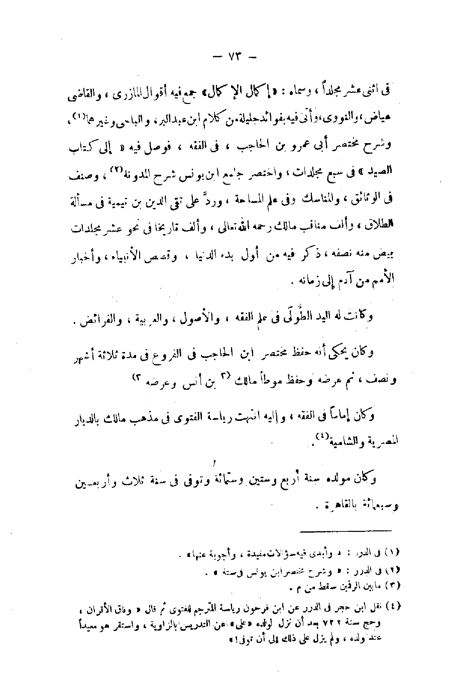 وكانت له اليد الطولى في علم الفقه والأصول والعربية والفرائض. وكان يحكى أنه حفظ مختصر بن الحاجب في الفروع في مدة ثلاثة أشهر ونصف ثم عرضه وحفظ موطأ مالك بن أنس وعرضه. وكان إماماً في الفقه وإليه انتهت رياسة الفتوى في مذهب مالك بالديار المصرية والشامية. وكان مولده سنة أربع وستين وستمائة وتوفي في سنة ثلاث وأربعين وسبعمائة بالقاهرة.