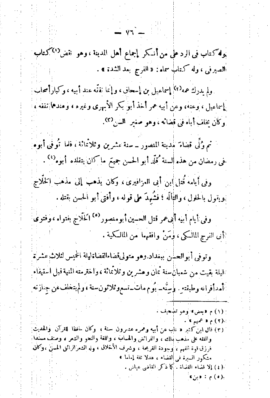 وله كتاب في الرد على من أنكر إجماع أهل المدينة وهو نقض كتاب الصيرفي وله كتاب سماه: الفرج بعد الشدة ولم يدرك عمهم إسماعيل بن إسحاق وإنما تفقه عند أبيه وكبار أصحاب إسماعيل وعنه وعن أبيه عمر أخذ أبو بكر الأبهري وغيره وعندهما تفقه وكان يخلف أباه في قضائه وهو صغير السن.