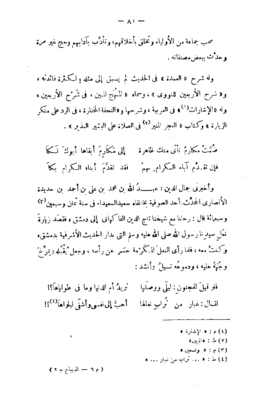 وأخبرني جمال الدين: عبد الله بن محمد بن علي بن أحمد بن حديدة الأنصاري المحدث: أحد الصوفية بخانقاه سعيد السعيداء في سنة ثمان وسبعين وسبعمائة قال: رحلنا مع شيخنا تاج الدين الفاكهاني إلى دمشق فقصد زيارة نعل سيدنا رسول الله صلى الله عليه وسلم التي بدار الحديث الأشرفية بدمشق وكنت معه فلما رأى النعل المكرمة حسر عن رأسه وجعل يقبله ويمرغ وجهه عليه ودموعه تسيل وأنشد:
