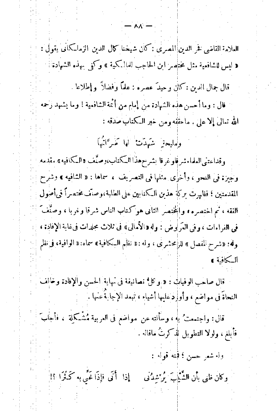 قال صاحب الوفيات: وكل تصانيفه في نهاية الحسن والإفادة وخالف النحاة في مواضع وأورد عليهم أشياء تبعد الإجابة عنها قال: واجتمعت به وسألته عن مواضع في العربية مشكلة وأجاب فأبلغ ولولا التطويل لذكرت ما قاله. وله شعر حسن فمنه قوله: