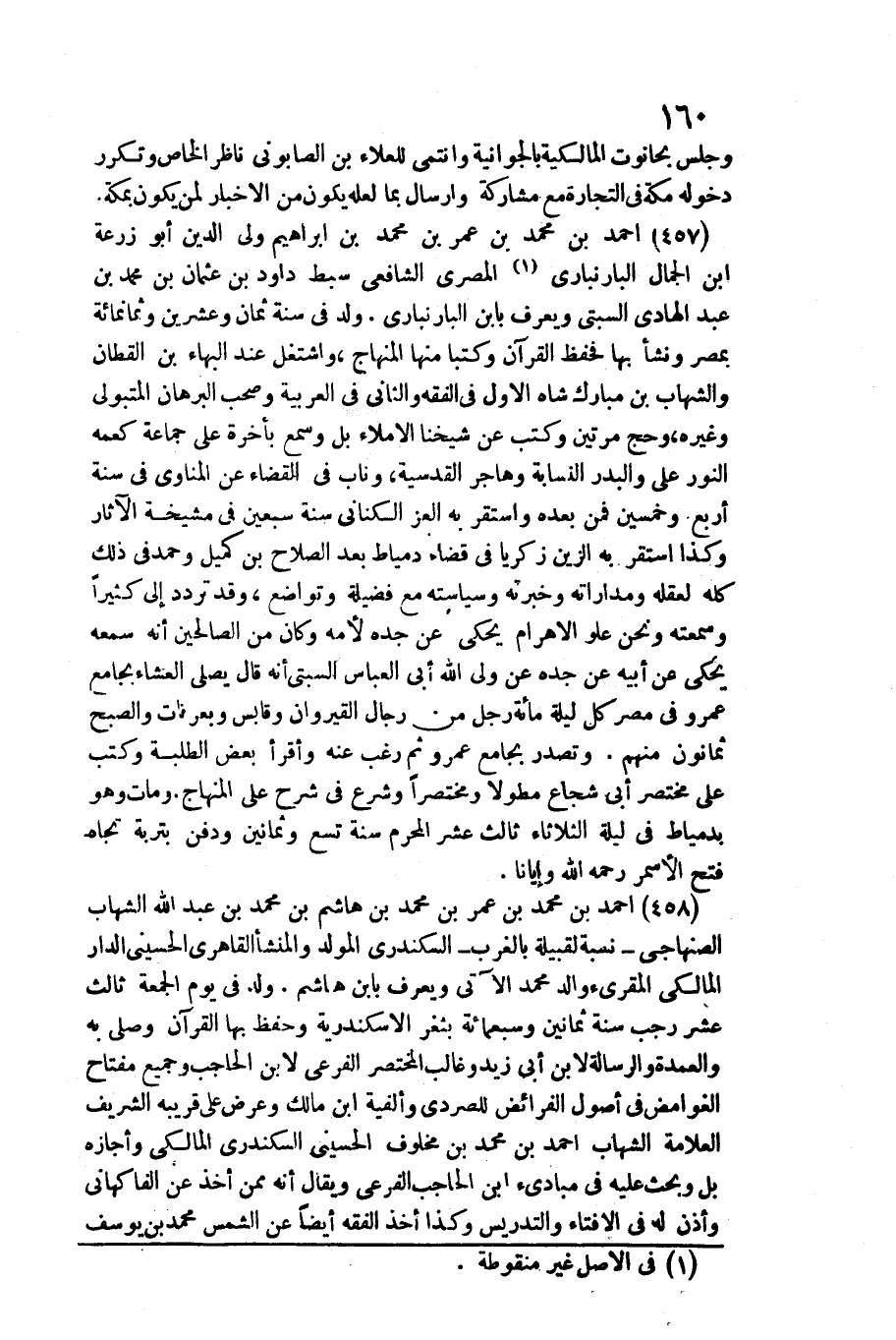 458 - أَحْمد بن مُحَمَّد بن عمر بن مُحَمَّد بن هَاشم بن مُحَمَّد بن عبد الله الشهَاب الصنهاجي نِسْبَة لقبيلة بالغرب السكندري المولد والمنشأ القاهري الْحُسَيْنِي الدَّار الْمَالِكِي الْمُقْرِئ وَالِد مُحَمَّد الْآتِي وَيعرف بِابْن هَاشم. / ولد فِي يَوْم الْجُمُعَة ثَالِث عشر رَجَب سنة ثَمَانِينَ وَسَبْعمائة بثغر الاسكندرية وَحفظ بهَا الْقُرْآن وَصلى بِهِ والعمدة والرسالة لِابْنِ أبي زيد وغالب الْمُخْتَصر الفرعي لِابْنِ الْحَاجِب وَجَمِيع مِفْتَاح الغوامض فِي أصُول الْفَرَائِض للصردي وألفية ابْن مَالك