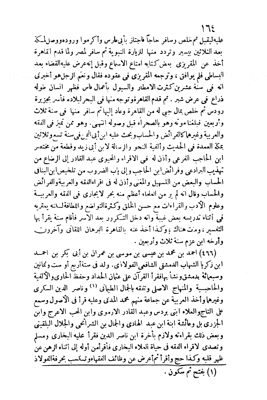 466 - أَحْمد بن مُحَمَّد بن عِيسَى بن مُوسَى بن عمرَان بن أبي بكر بن أَحْمد بن زَكَرِيَّا الشهَاب الدِّمَشْقِي الشَّافِعِي الفولاذي. / ولد فِي سِتَّة أَربع أَو سِتّ وَثَمَانِينَ وَسَبْعمائة بِدِمَشْق وَنَشَأ بهَا فَقَرَأَ الْقُرْآن على عُثْمَان الْحداد وَحفظ الْحَاوِي والألفية والحاجبية والمنهاج الْأَصْلِيّ وتفقه بالجمال)