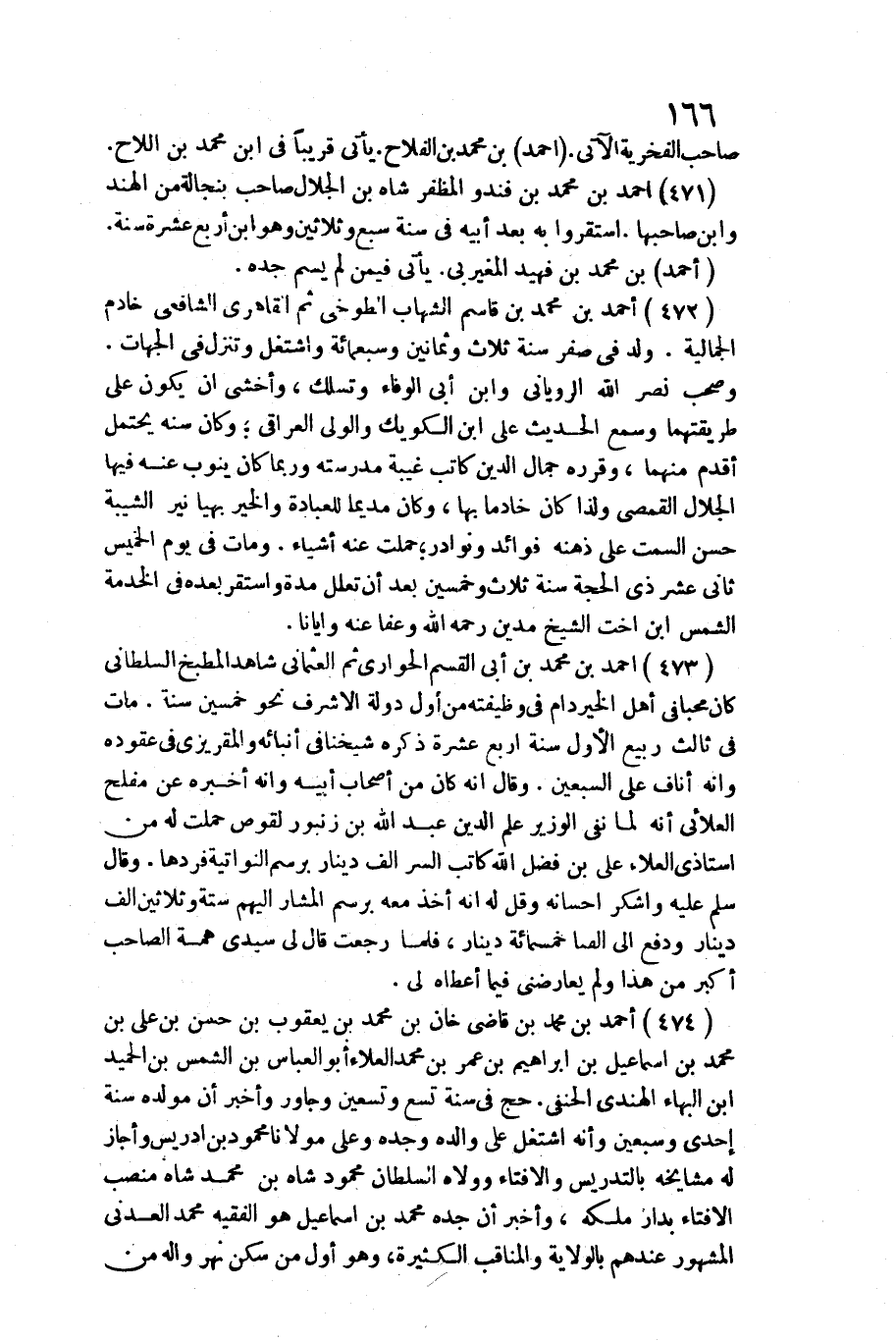 474 - أَحْمد بن مُحَمَّد بن قَاضِي خَان بن مُحَمَّد بن يَعْقُوب بن حسن بن عَليّ بن مُحَمَّد بن إِسْمَاعِيل بن إِبْرَاهِيم بن عمر بن مُحَمَّد الْعَلَاء أَبُو الْعَبَّاس بن الشَّمْس بن الحميد بن الْبَهَاء الْهِنْدِيّ الْحَنَفِيّ. / حج فِي سنة تسع وَتِسْعين وجاور وَأخْبر أَن مولده سنة إِحْدَى وَسبعين وَأَنه اشْتغل على وَالِده وجده وعَلى مَوْلَانَا مَحْمُود بن إِدْرِيس وَأَجَازَ لَهُ مشايخه بالتدريس والإفتاء وولاه السُّلْطَان مَحْمُود شاه بن مُحَمَّد شاه منصب الْإِفْتَاء بدار ملكه، وَأخْبر أَن جده مُحَمَّد بن إِسْمَاعِيل هُوَ الْفَقِيه مُحَمَّد الْعَدنِي الْمَشْهُور عِنْدهم بِالْولَايَةِ والمناقب الْكَثِيرَة، وَهُوَ أول من سكن نهر واله من