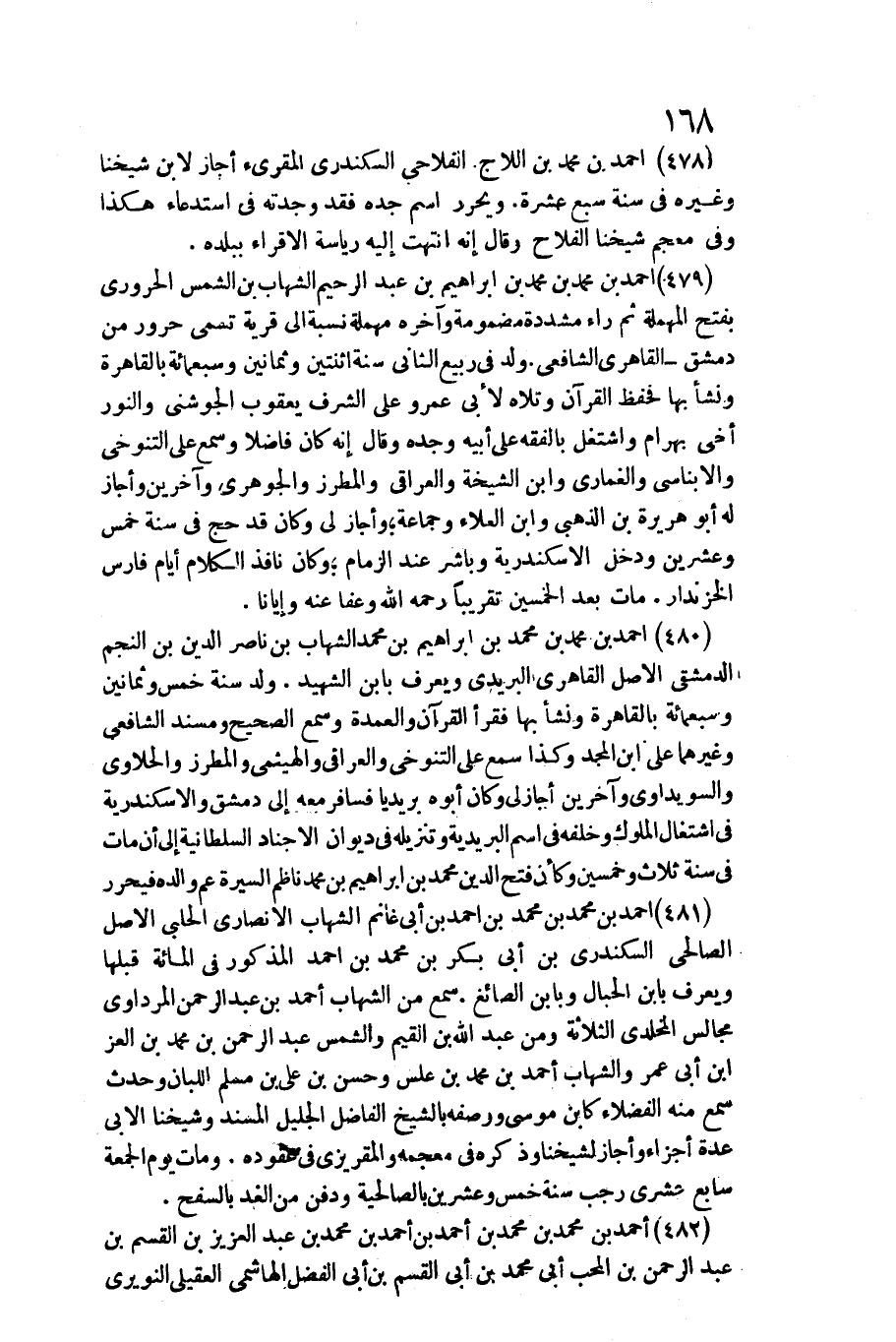 478 - أَحْمد بن مُحَمَّد بن اللاج القلاحي السكندري الْمُقْرِئ / أجَاز لِابْنِ شَيخنَا وَغَيره فِي سنة سبع عشرَة. وَيُحَرر اسْم جده فقد وجدته فِي استدعاء هَكَذَا وَفِي مُعْجم شَيخنَا الْفَلاح وَقَالَ إِنَّه انْتَهَت إِلَيْهِ رياسة الإقراء بِبَلَدِهِ.