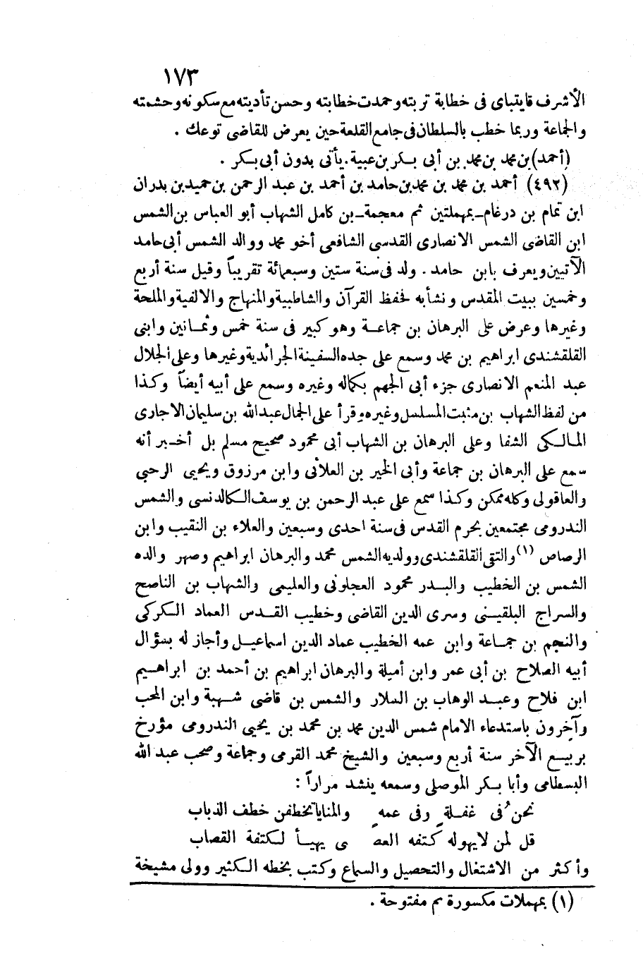 492 - أَحْمد بن مُحَمَّد بن مُحَمَّد بن حَامِد بن أَحْمد بن عبد الرَّحْمَن بن حميد بن بدران بن تَمام بن درغام بمهملتين ثمَّ مُعْجمَة بن كَامِل الشهَاب أَبُو الْعَبَّاس بن الشَّمْس بن القَاضِي الشَّمْس الْأنْصَارِيّ الْقُدسِي الشَّافِعِي أَخُو مُحَمَّد ووالد الشَّمْس أبي حَامِد الآتيين وَيعرف بِابْن حَامِد. / ولد فِي سنة سِتِّينَ وَسَبْعمائة تَقْرِيبًا وَقيل سنة أَربع وَخمسين بِبَيْت الْمُقَدّس وَنَشَأ بِهِ فحفظ الْقُرْآن